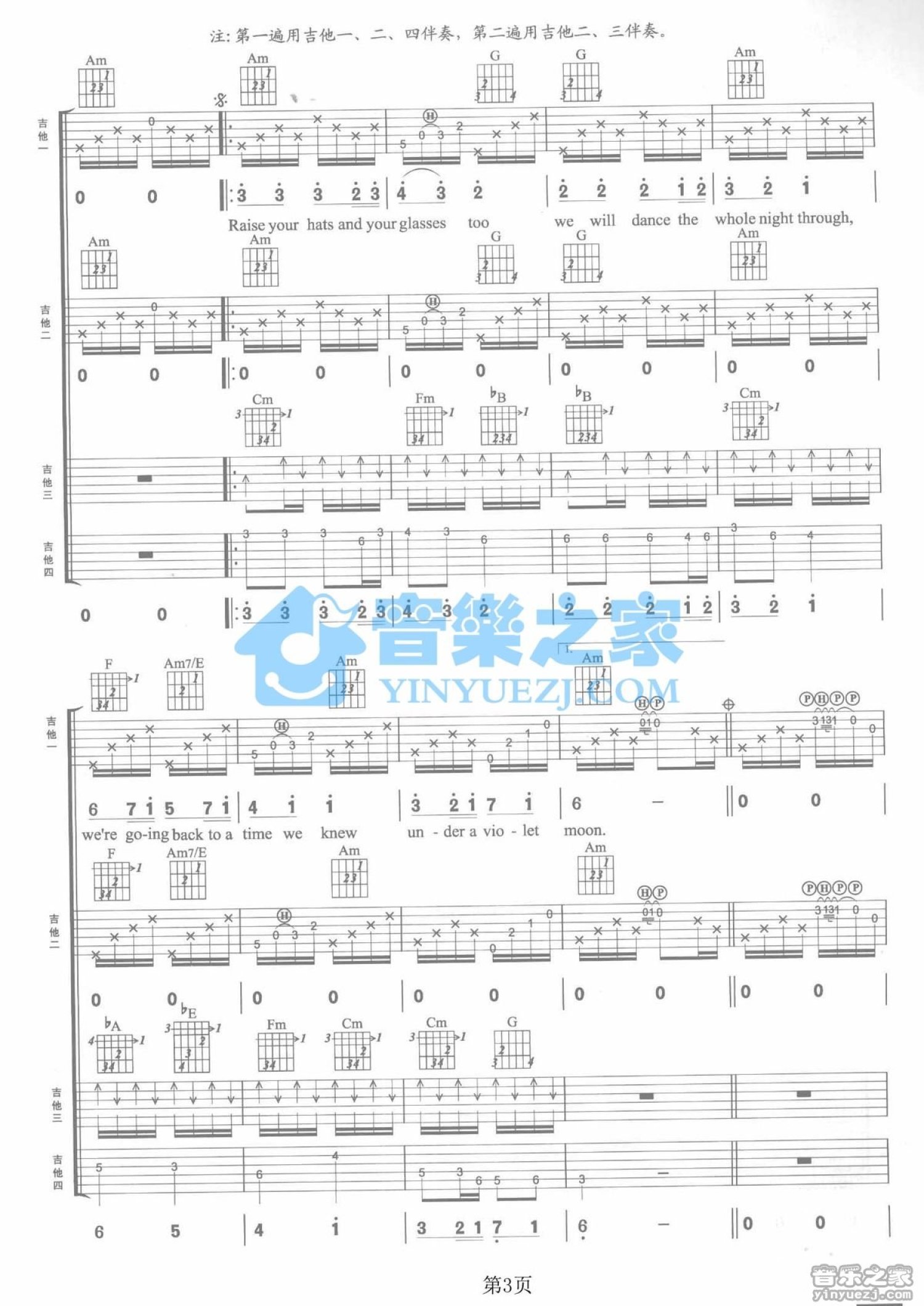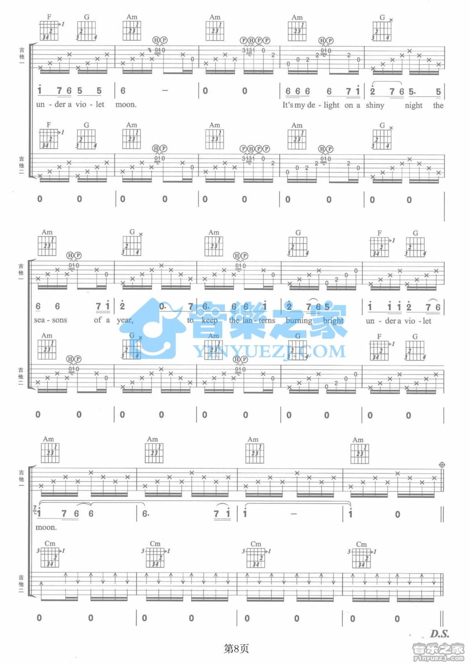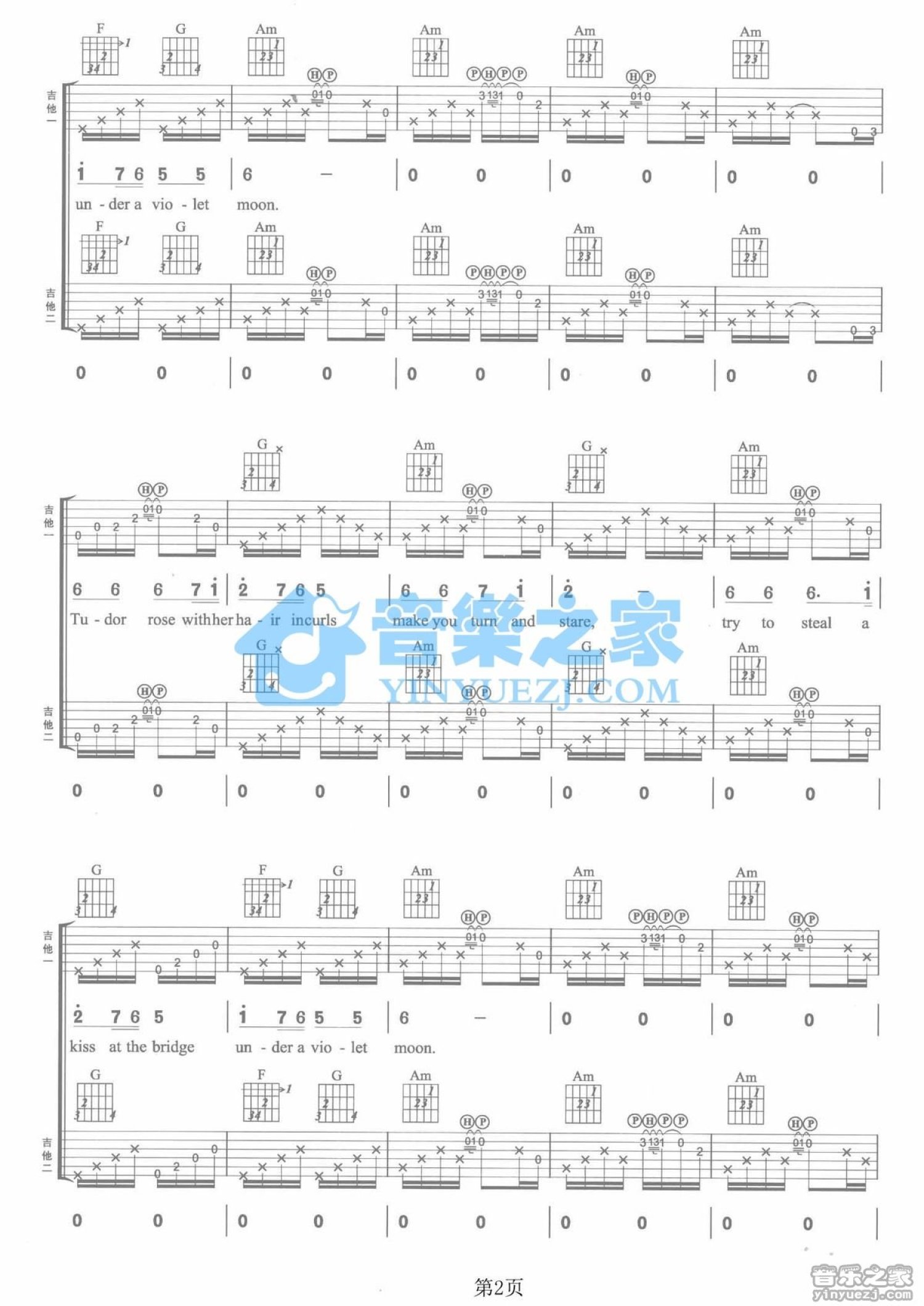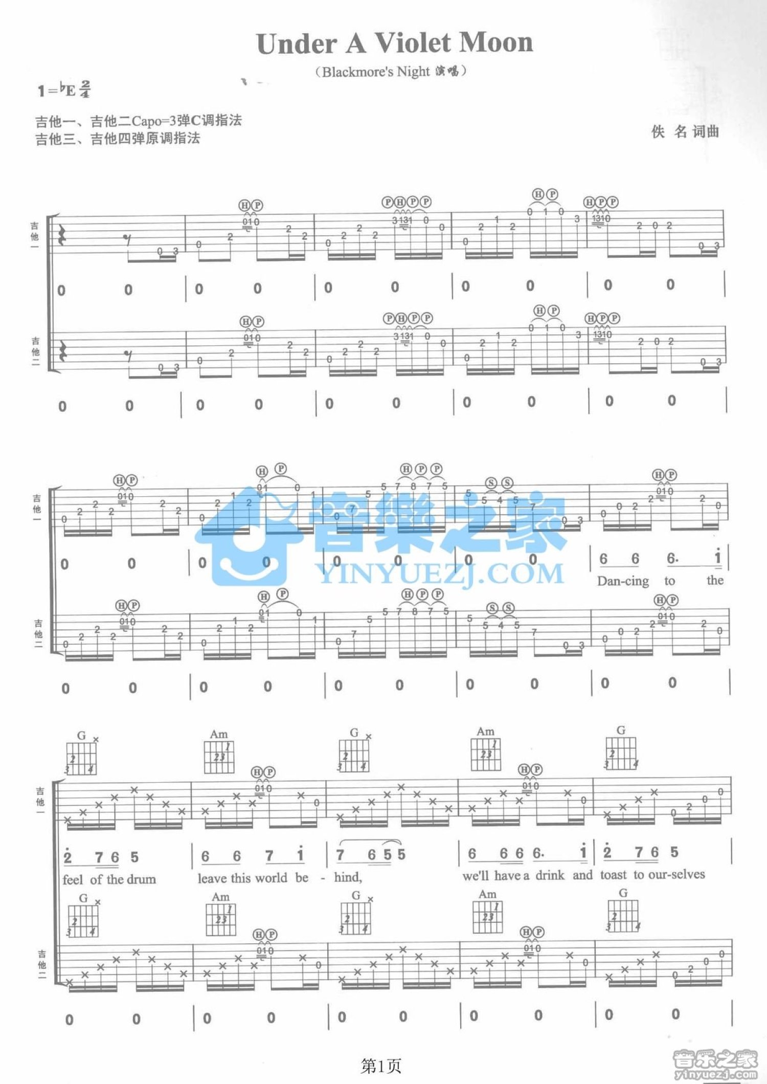 曲谱介绍: C调双吉他版Blackmore'sNight《UnderaVioletMoon》吉他弹唱六线谱