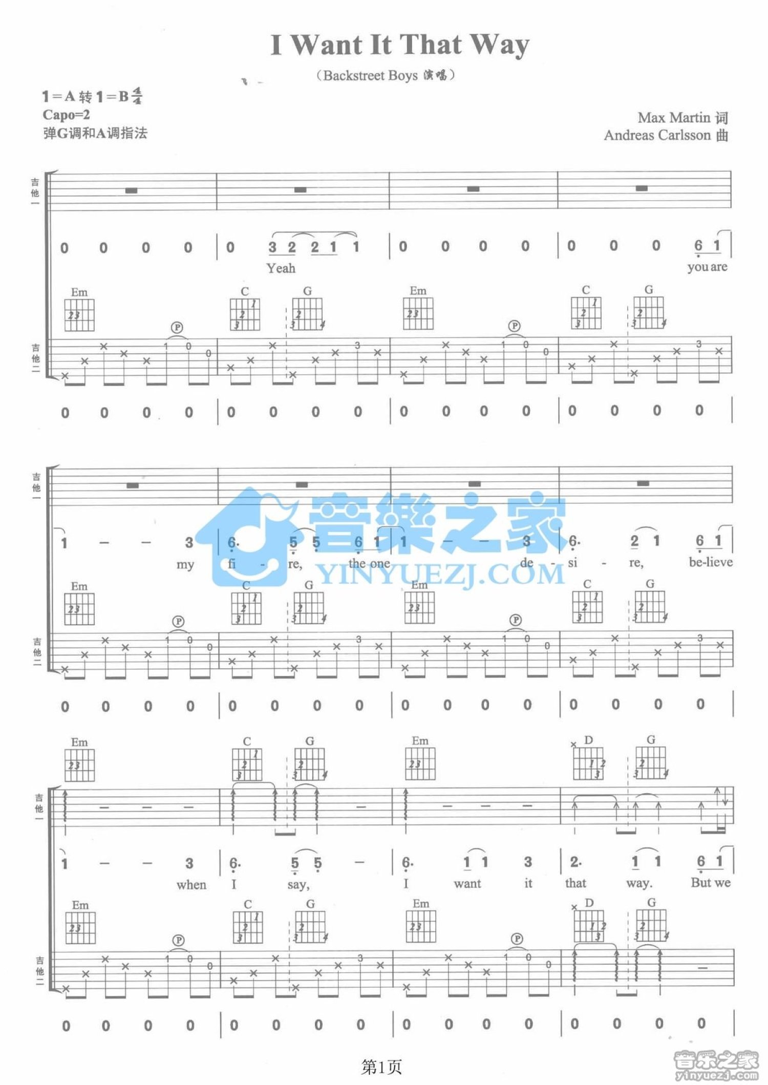 曲谱介绍: G调双吉他版BackstreetBoys《IWantItThatWay》吉他弹唱六线谱