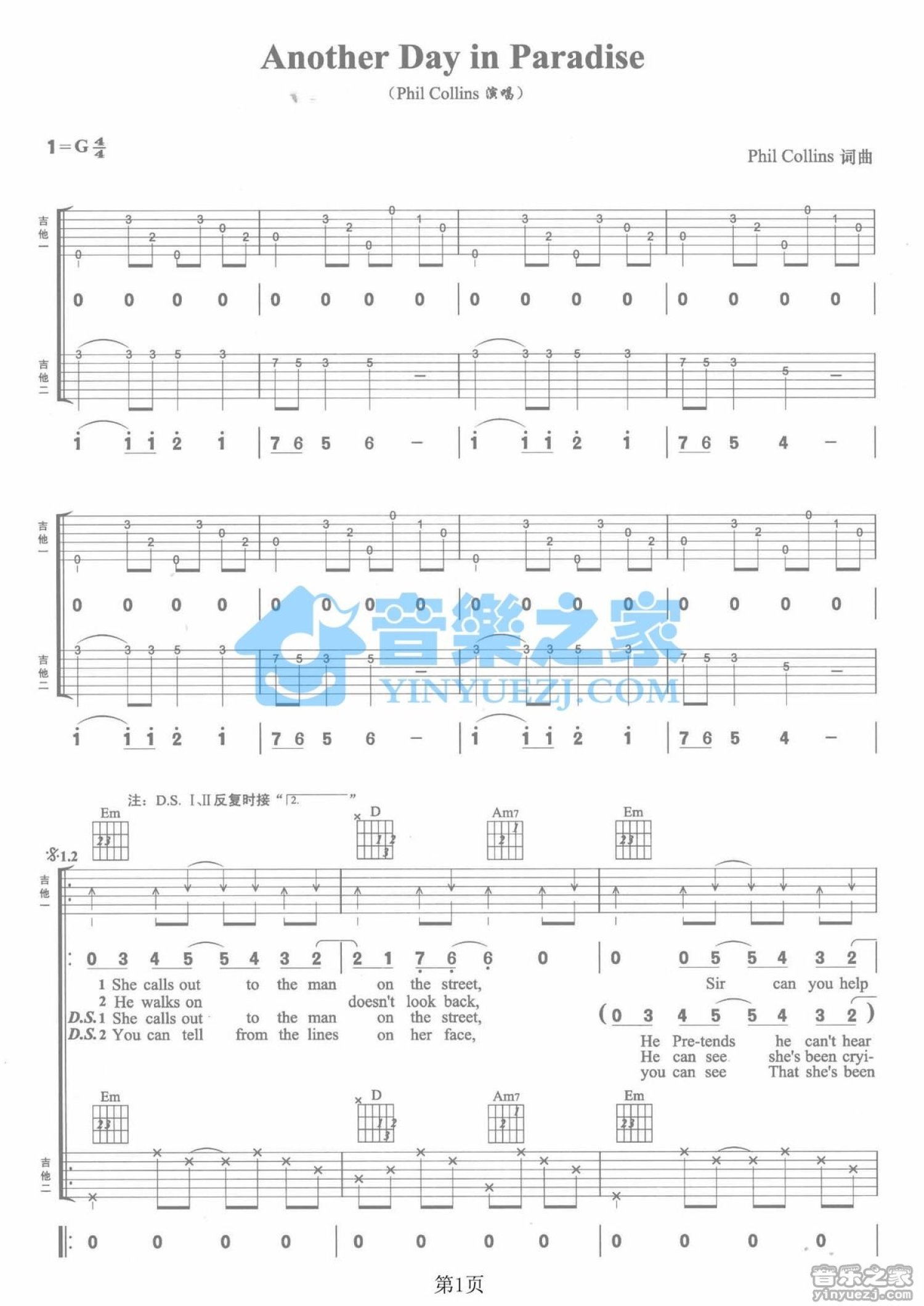 Another Day In Paradise吉他谱 - PhilCollins - G调吉他弹唱谱 - 双吉他版
