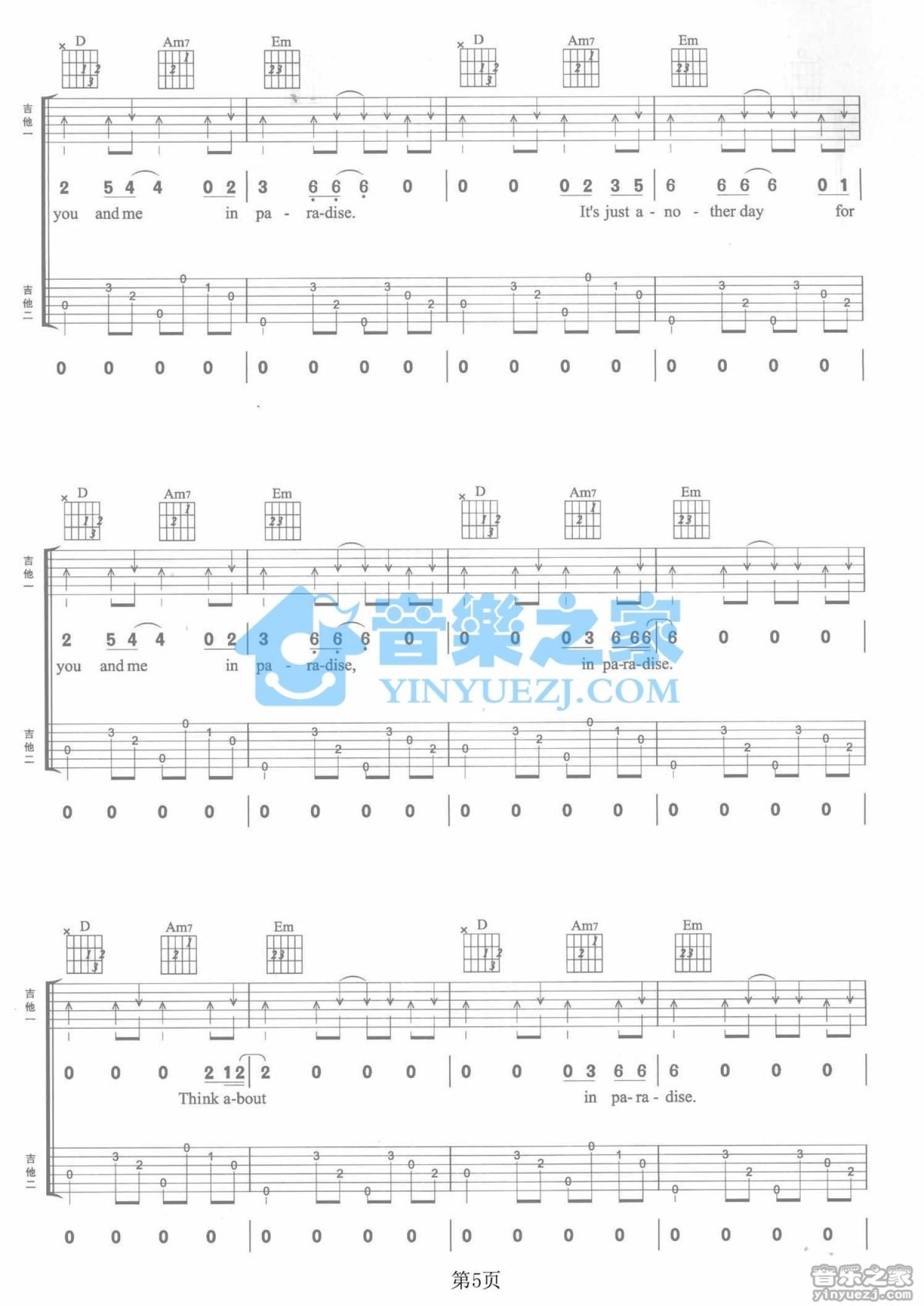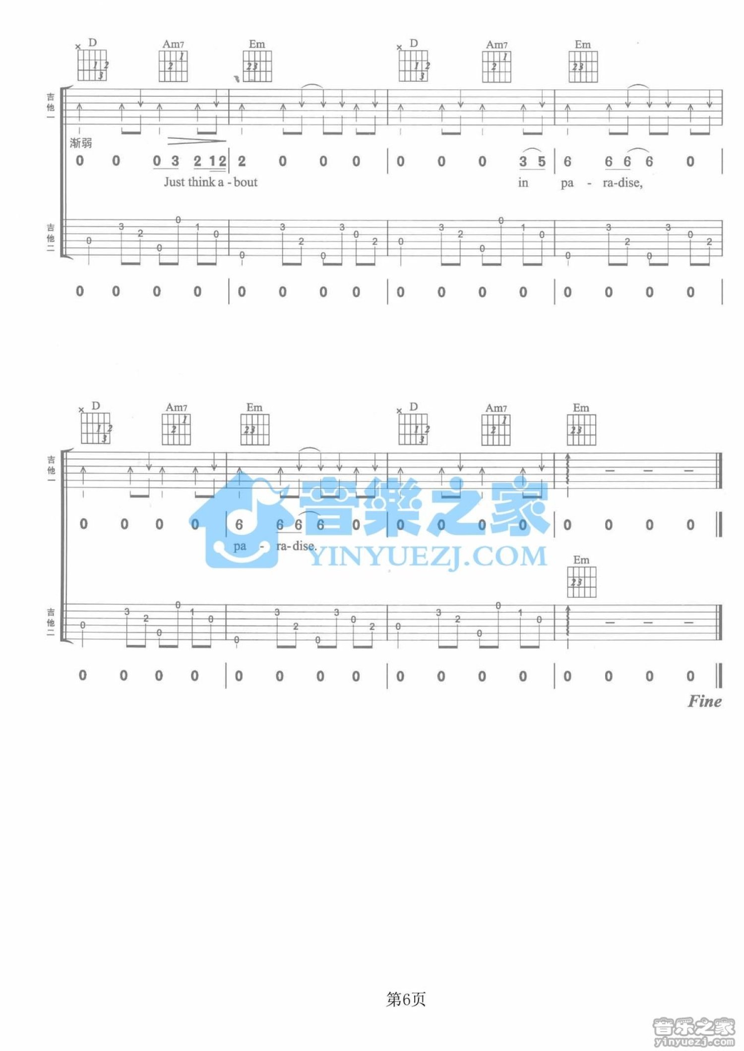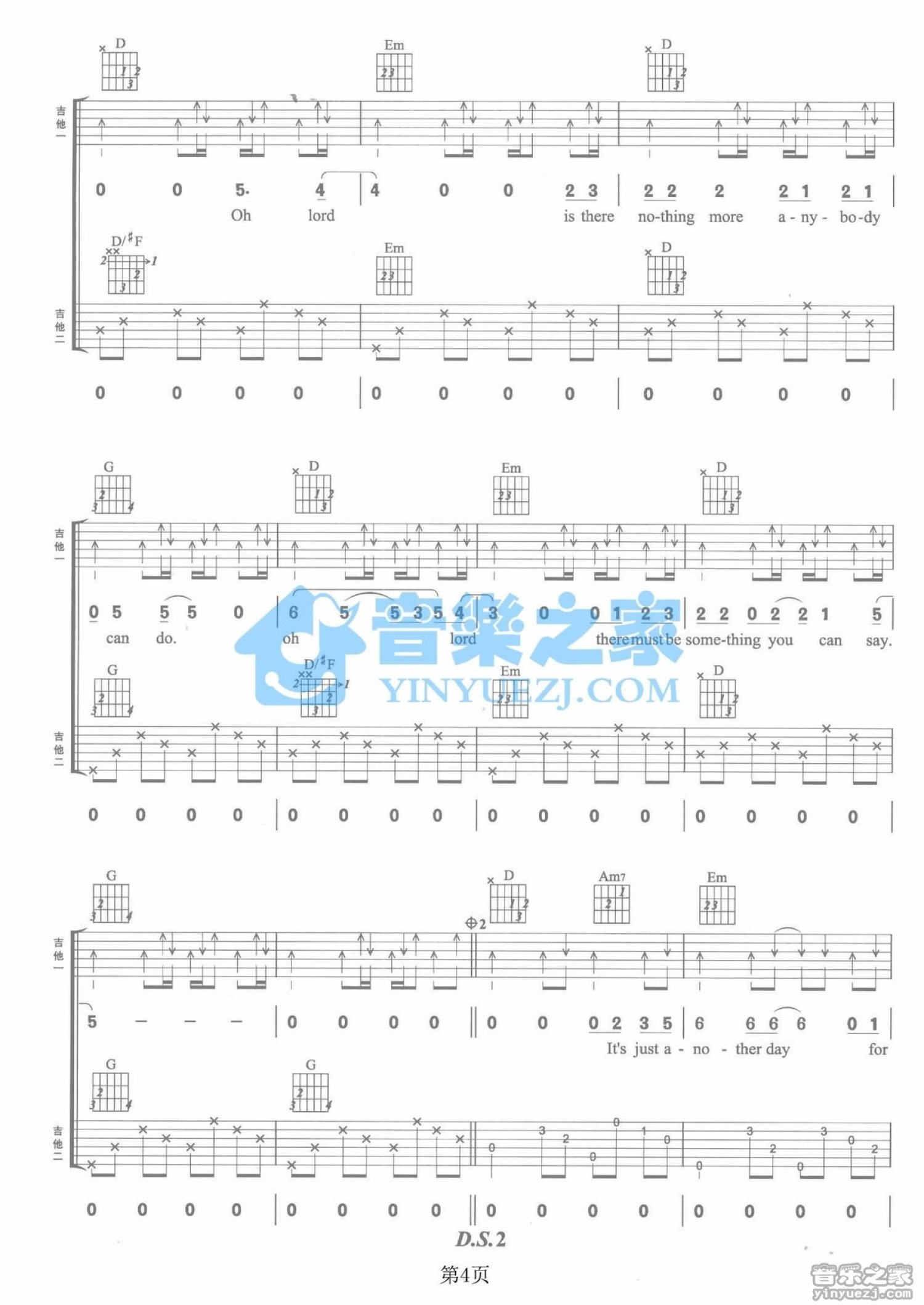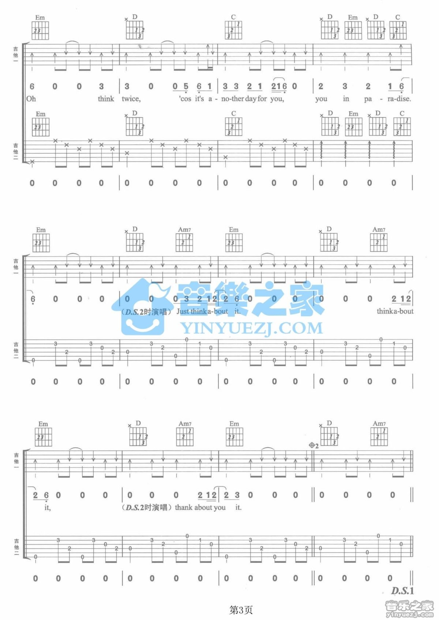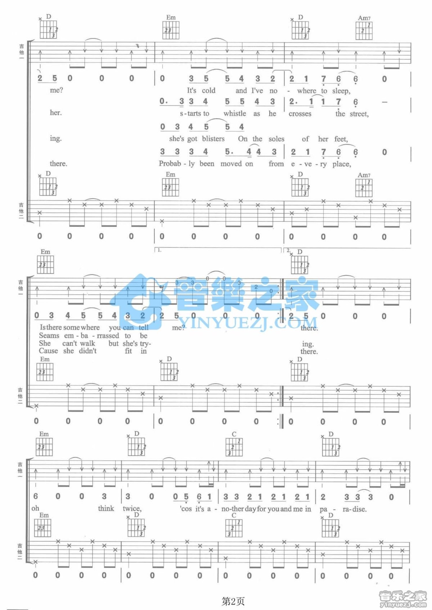 曲谱介绍: G调《AnotherDayInParadise》吉他弹唱六线谱