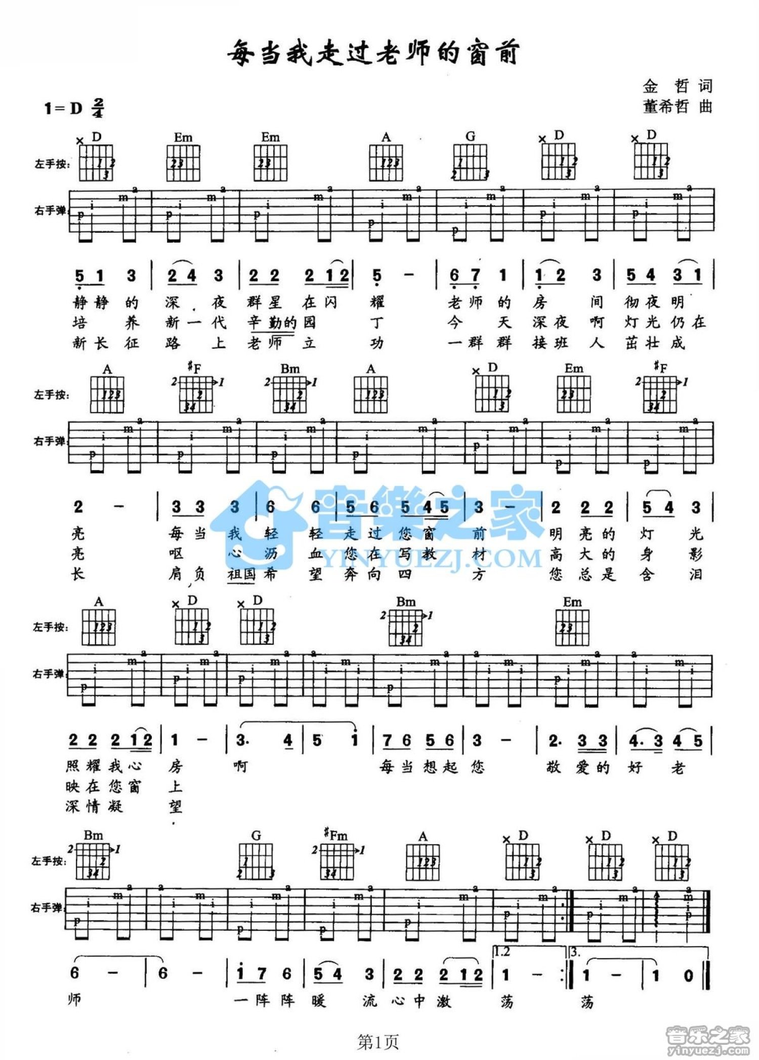 曲谱介绍: D调版儿歌《每当我走过老师的窗前》吉他弹唱六线谱