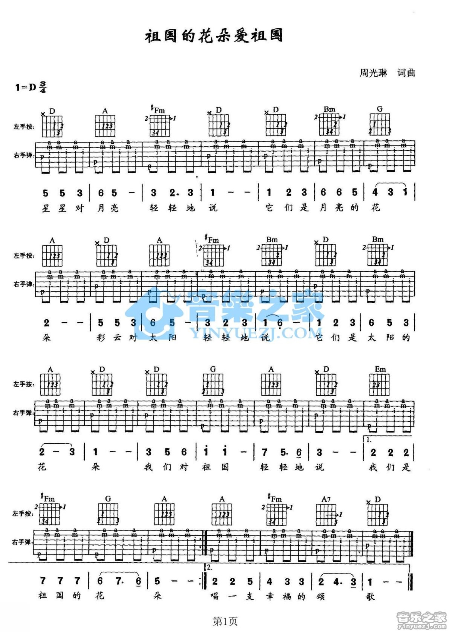 曲谱介绍: D调版儿歌《祖国的花朵爱祖国》吉他弹唱六线谱