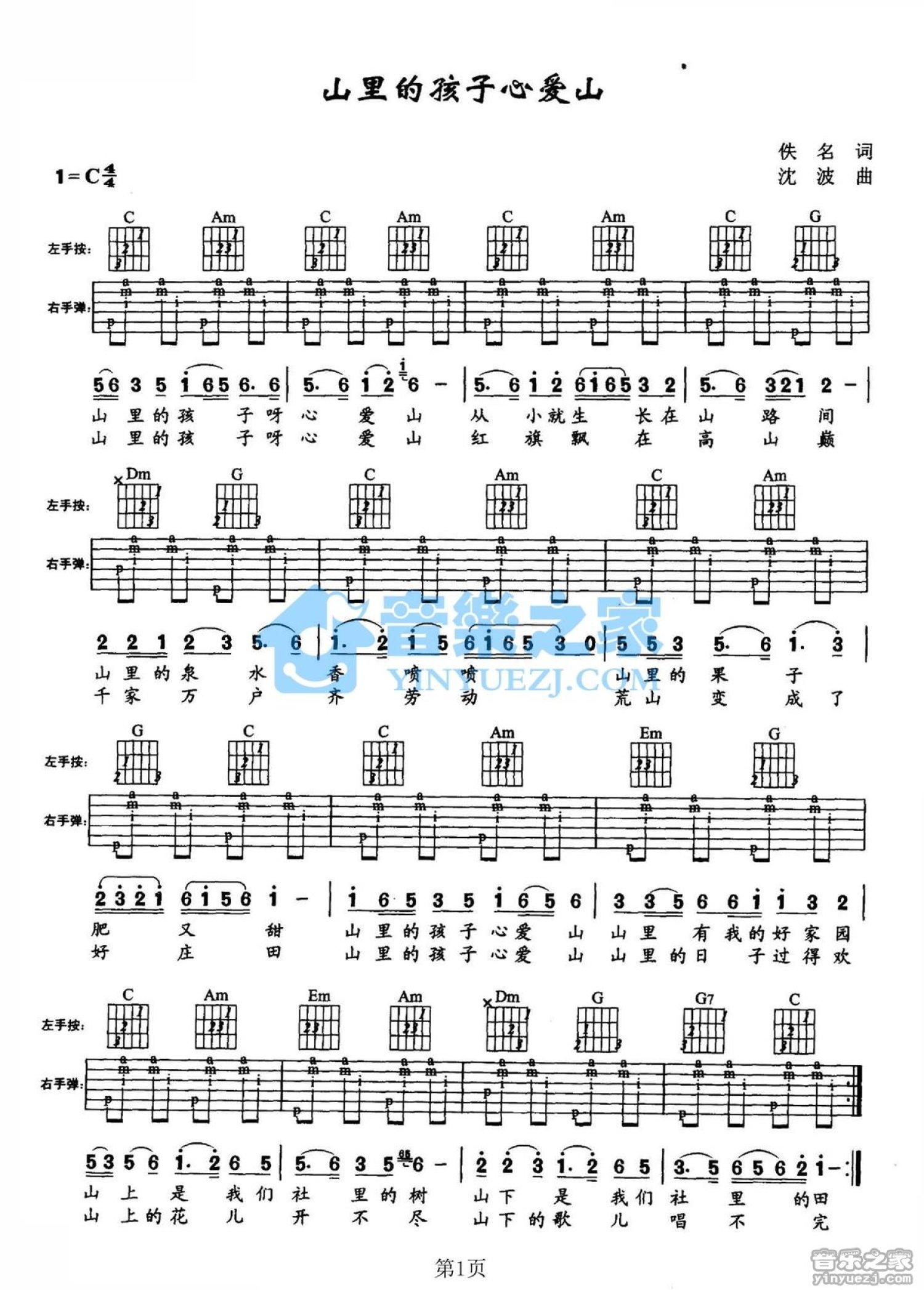 曲谱介绍: C调版儿歌《山里的孩子心爱山》吉他弹唱六线谱