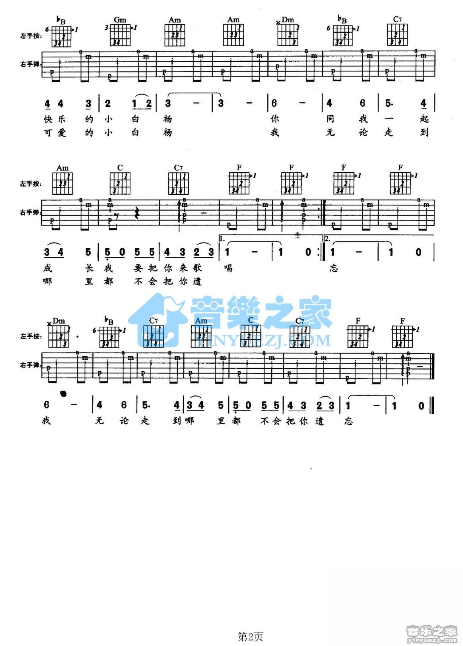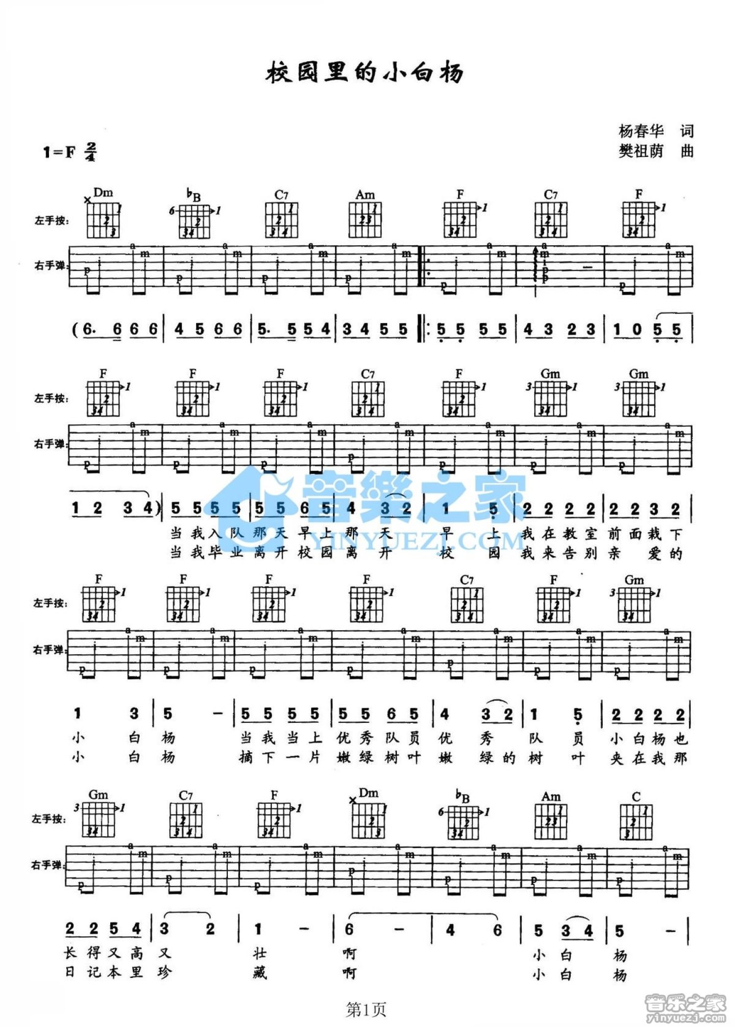 曲谱介绍: F调版儿歌《校园里的小白杨》吉他弹唱六线谱