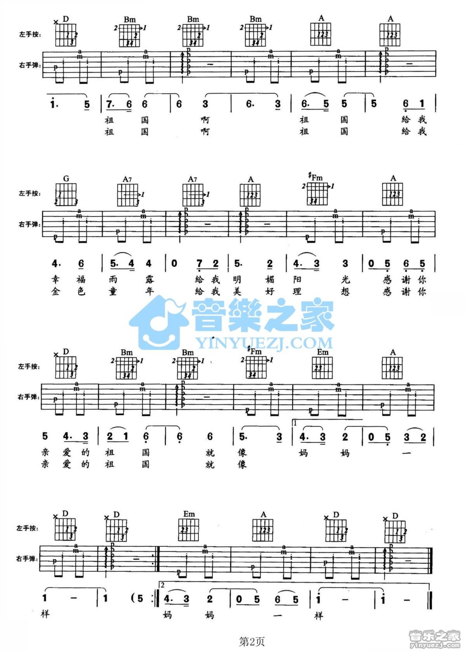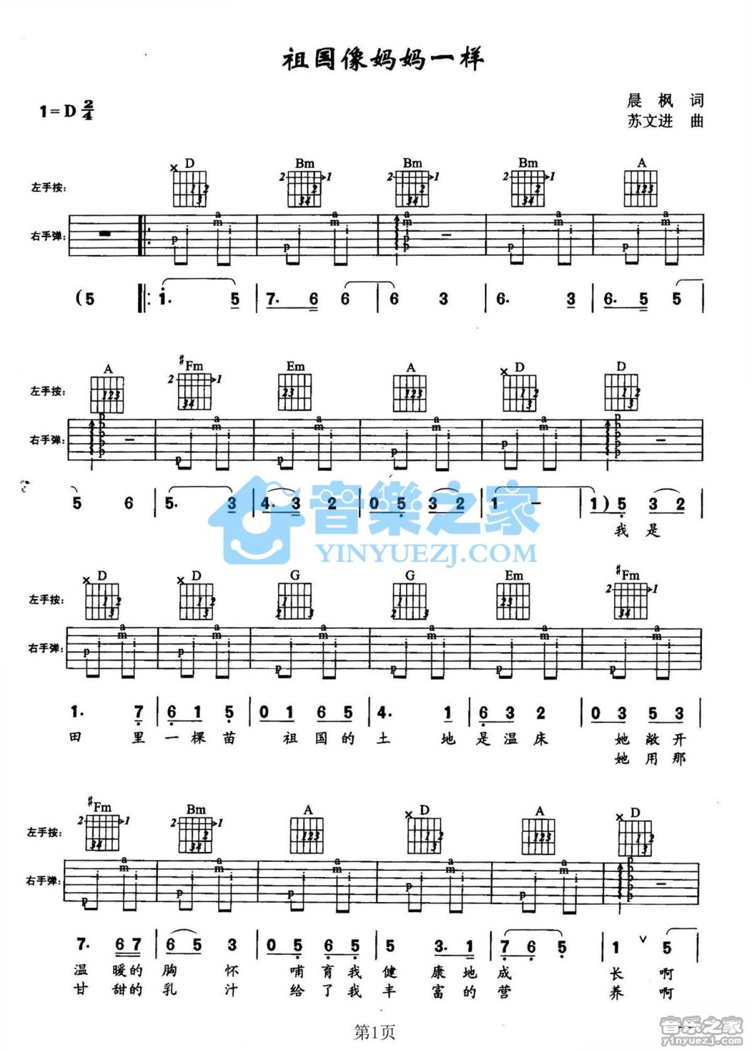 曲谱介绍: D调版儿歌《祖国像妈妈一样》吉他弹唱六线谱