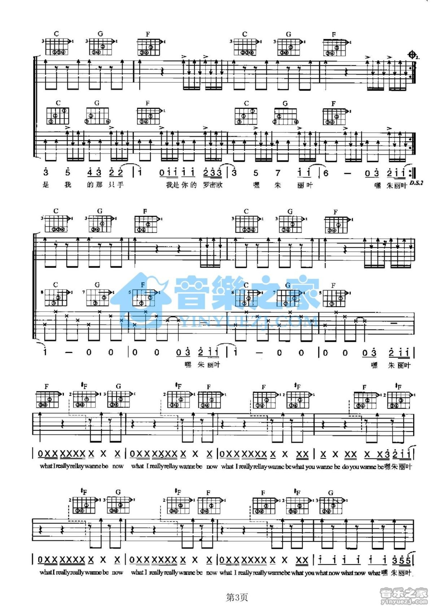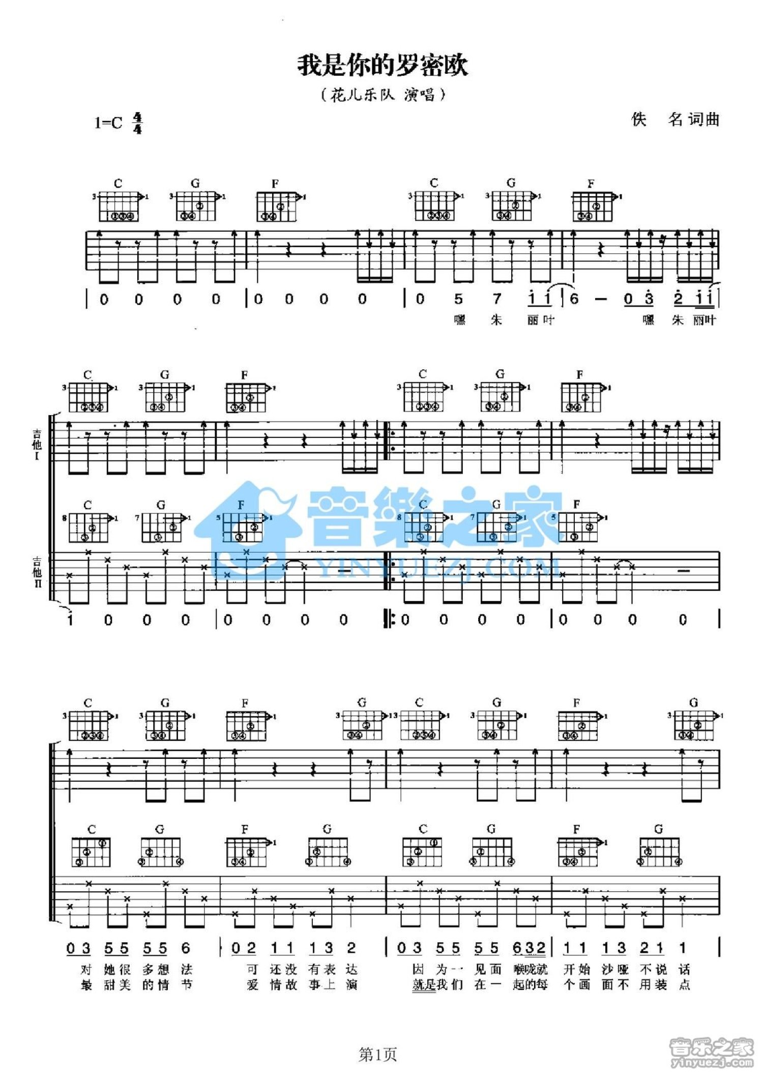 曲谱介绍: C调双吉他版花儿乐队《我是你的罗密欧》吉他弹唱六线谱