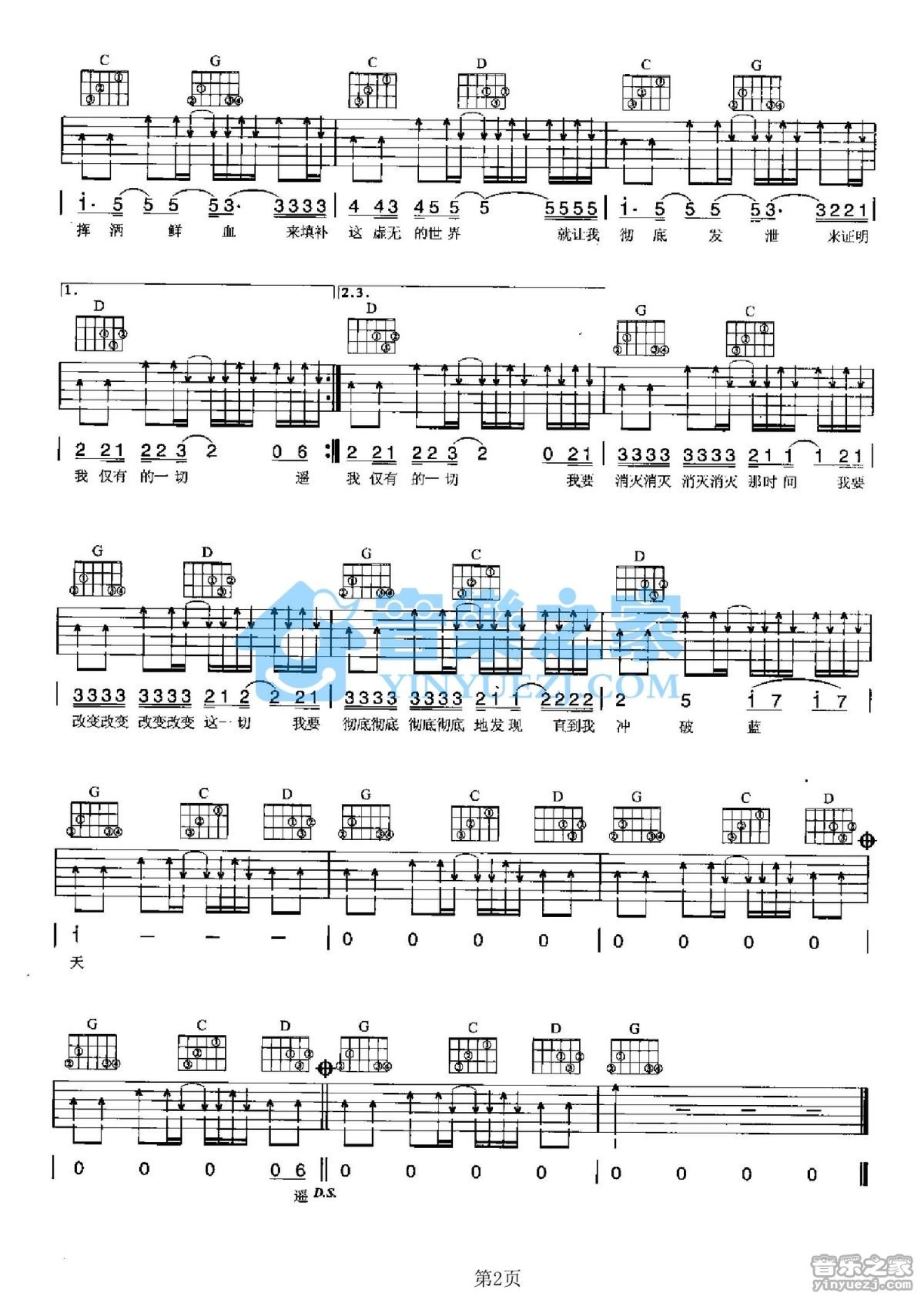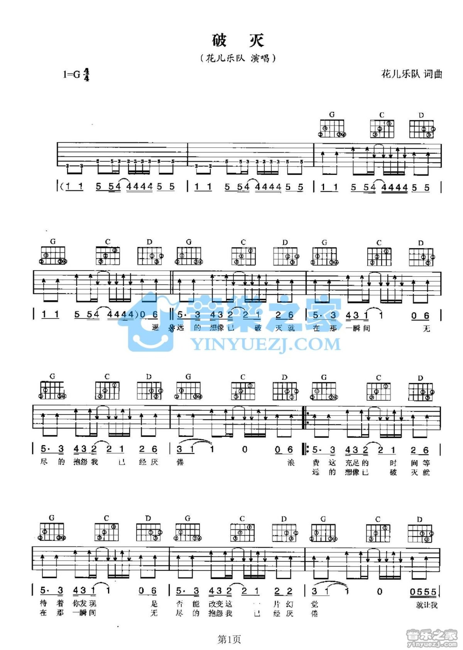 曲谱介绍: G调版花儿乐队《破灭》吉他弹唱六线谱