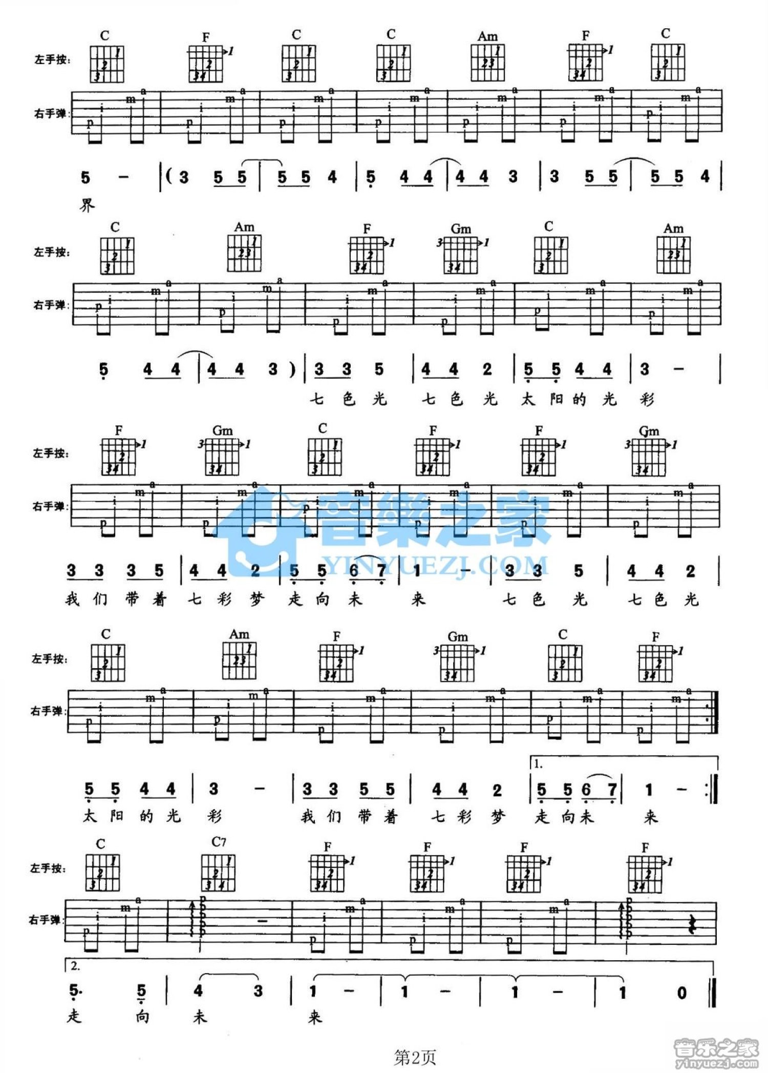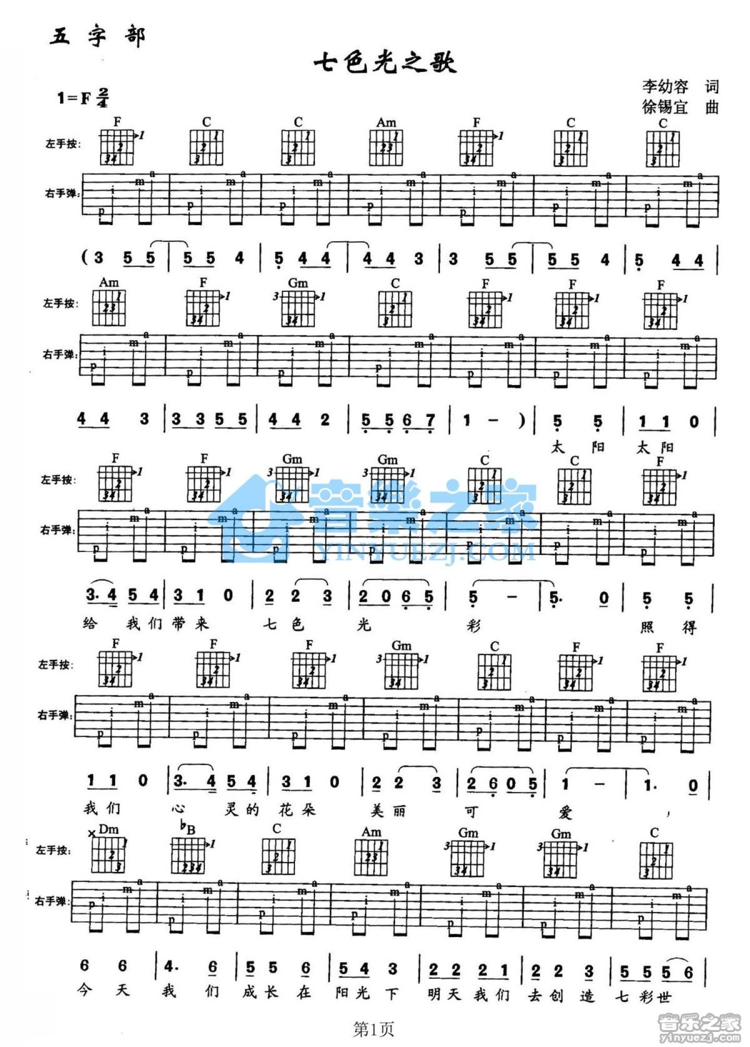 曲谱介绍: F调版儿歌《七色光之歌》吉他弹唱六线谱