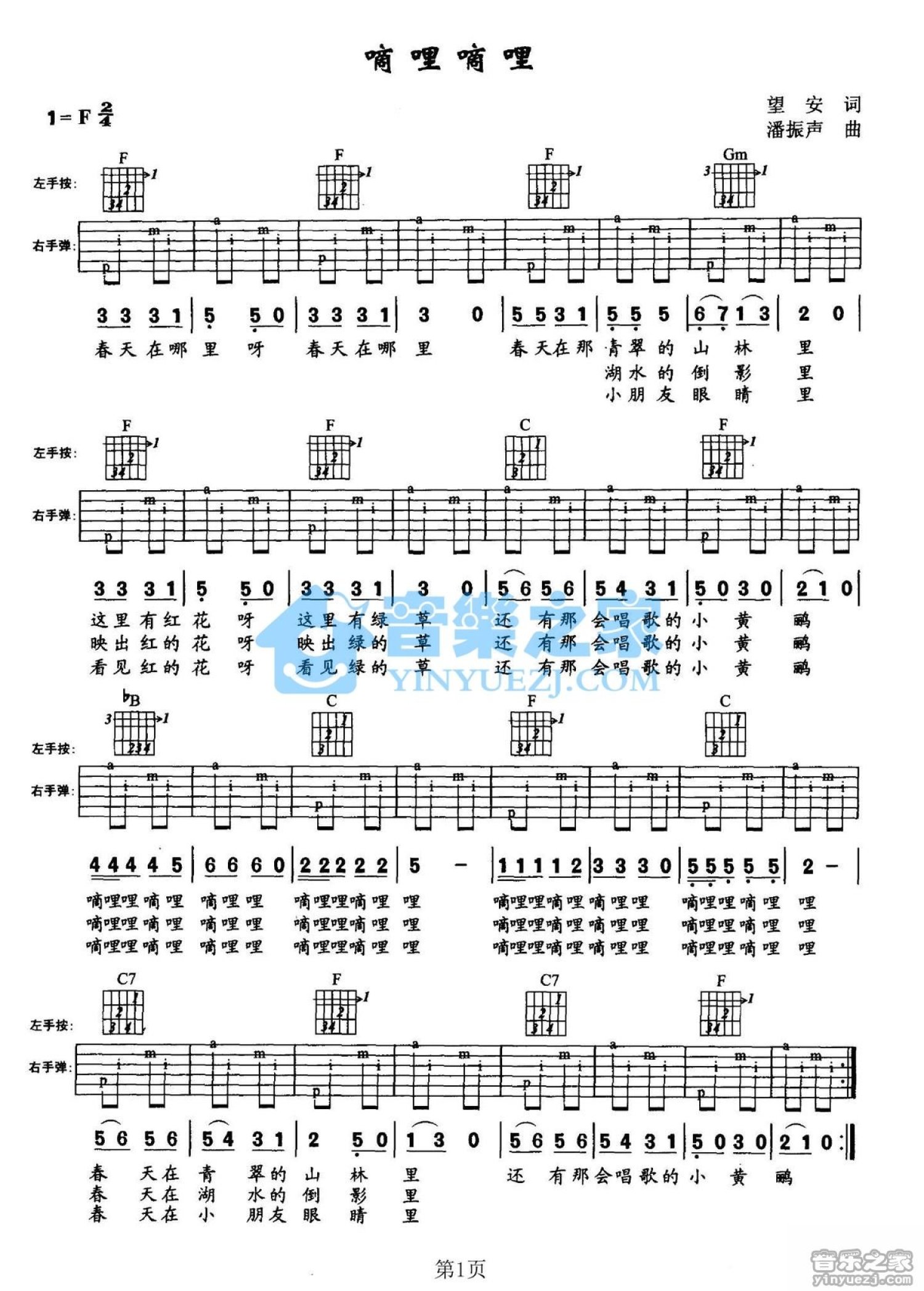 曲谱介绍: F调版儿歌《嘀哩嘀哩》吉他弹唱六线谱