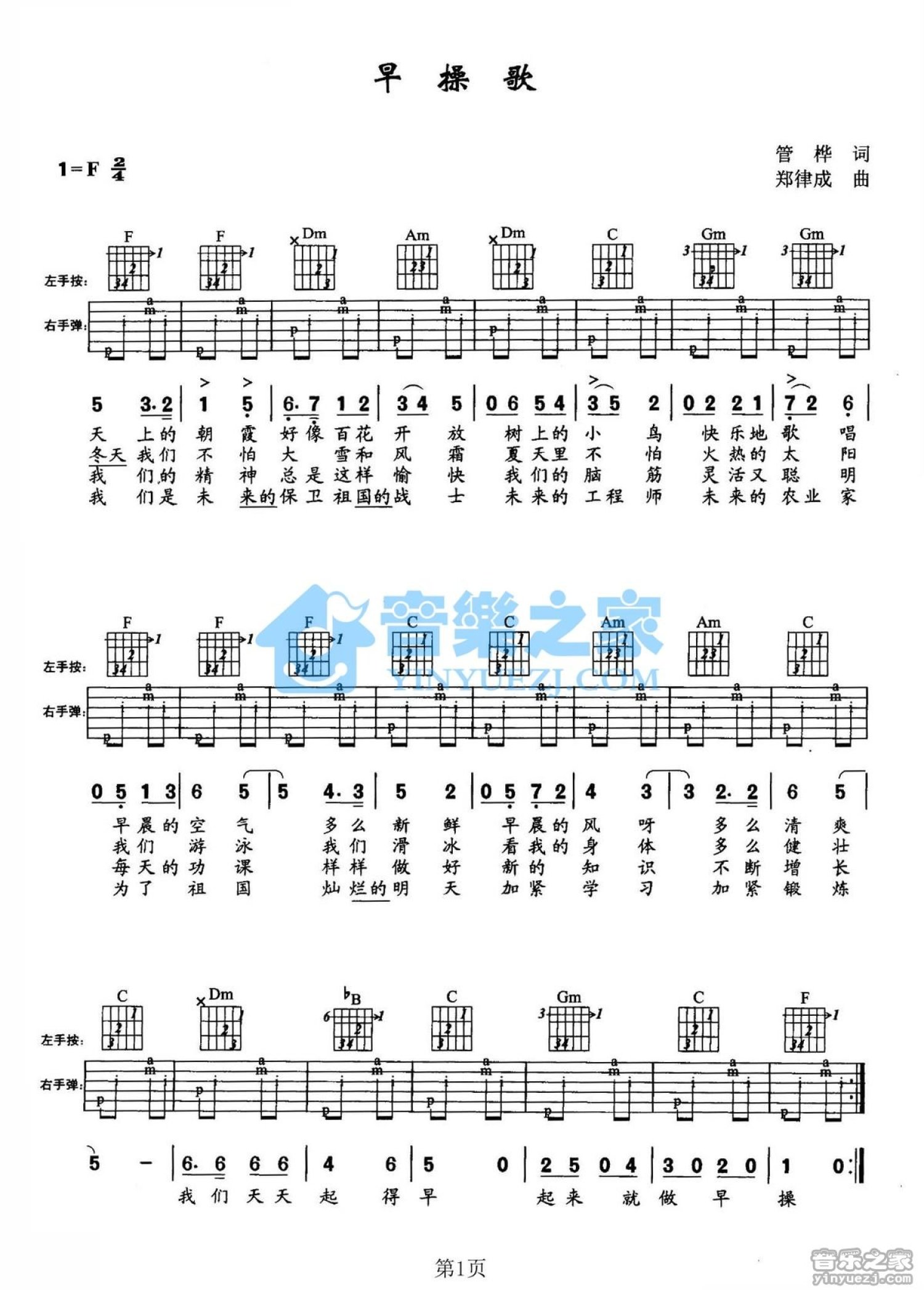 曲谱介绍: F调版儿歌《早操歌》吉他弹唱六线谱