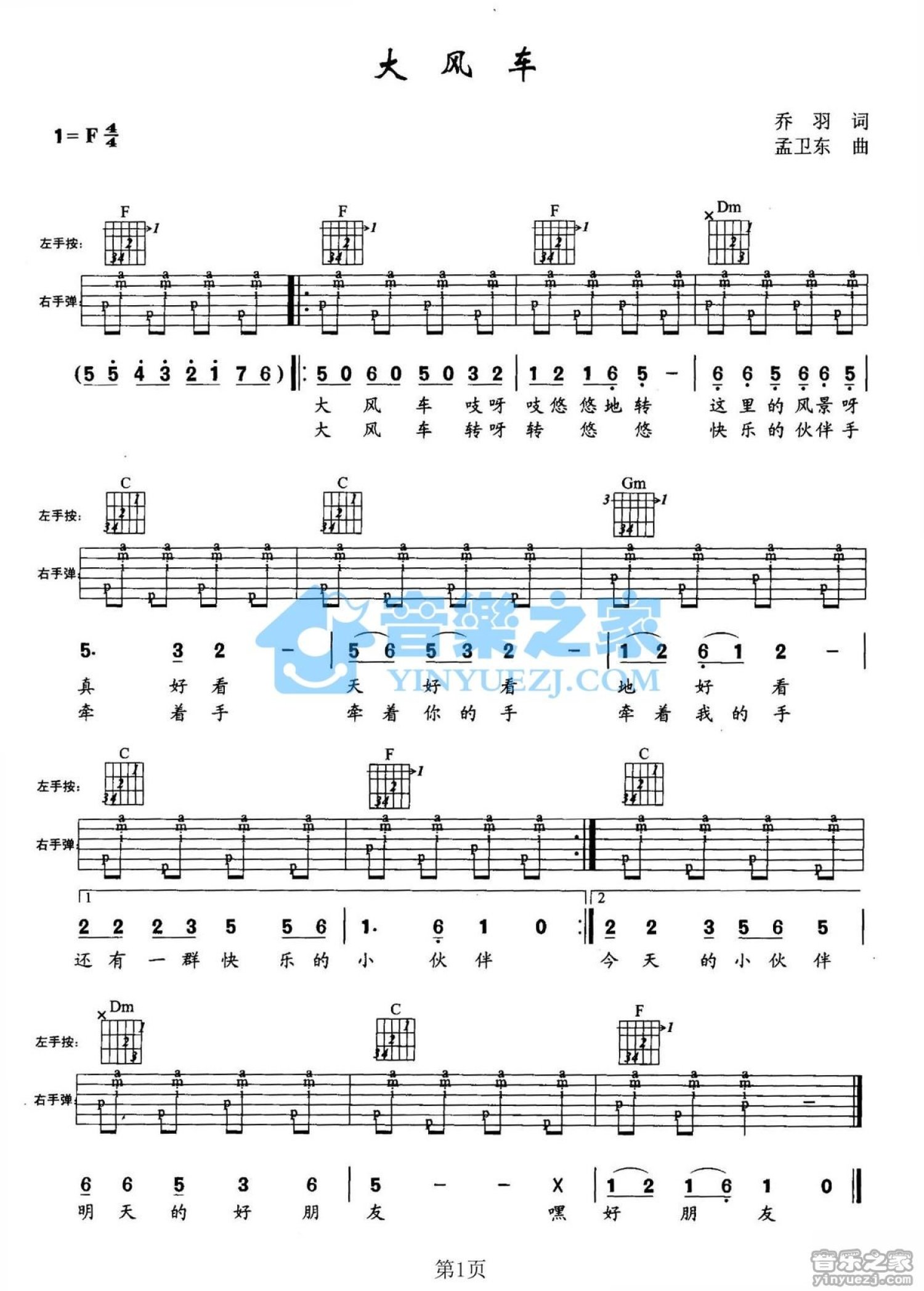 曲谱介绍: F调版 儿歌《大风车》吉他弹唱六线谱