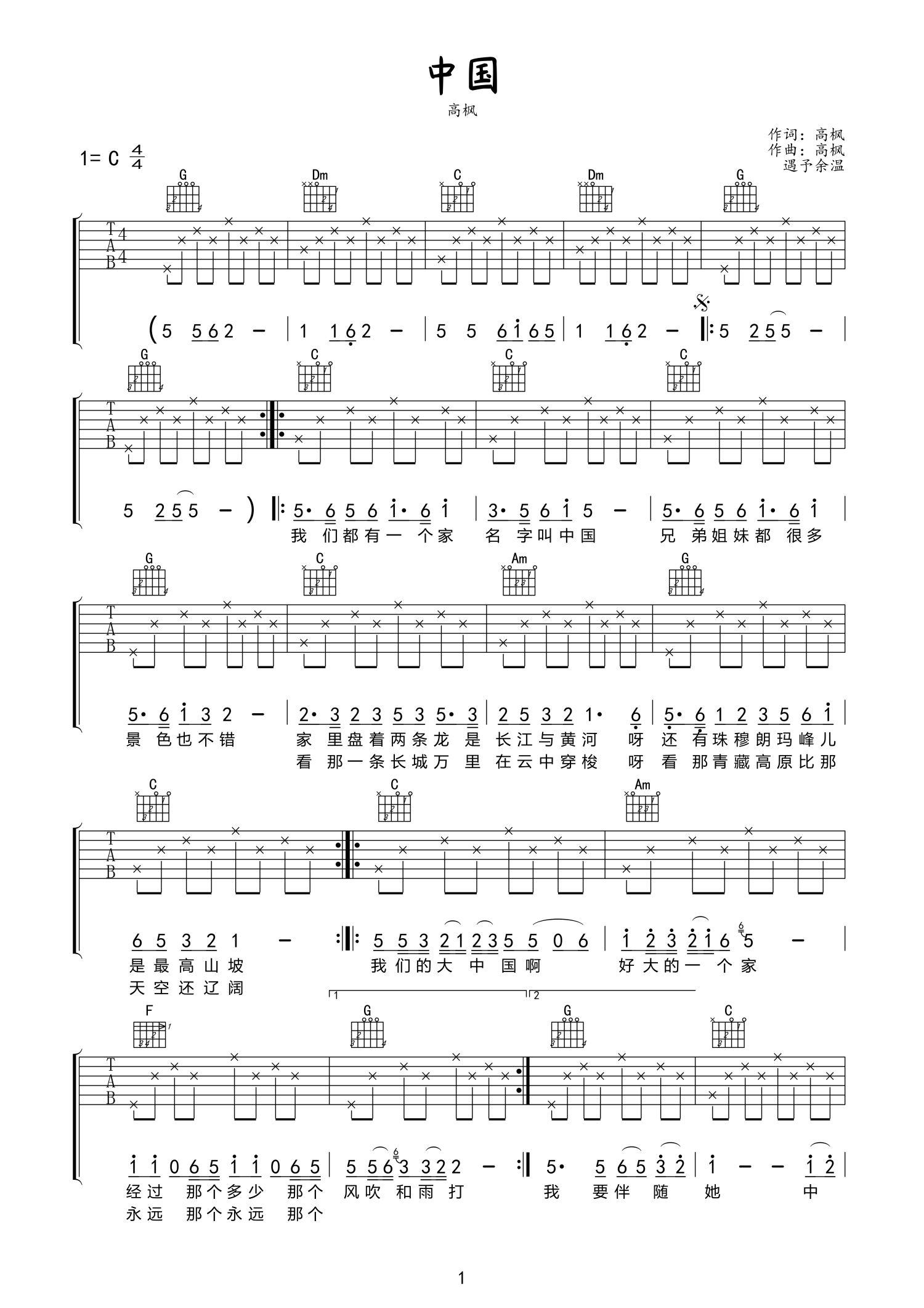 曲谱介绍: C调版儿歌《中国》吉他弹唱六线谱
