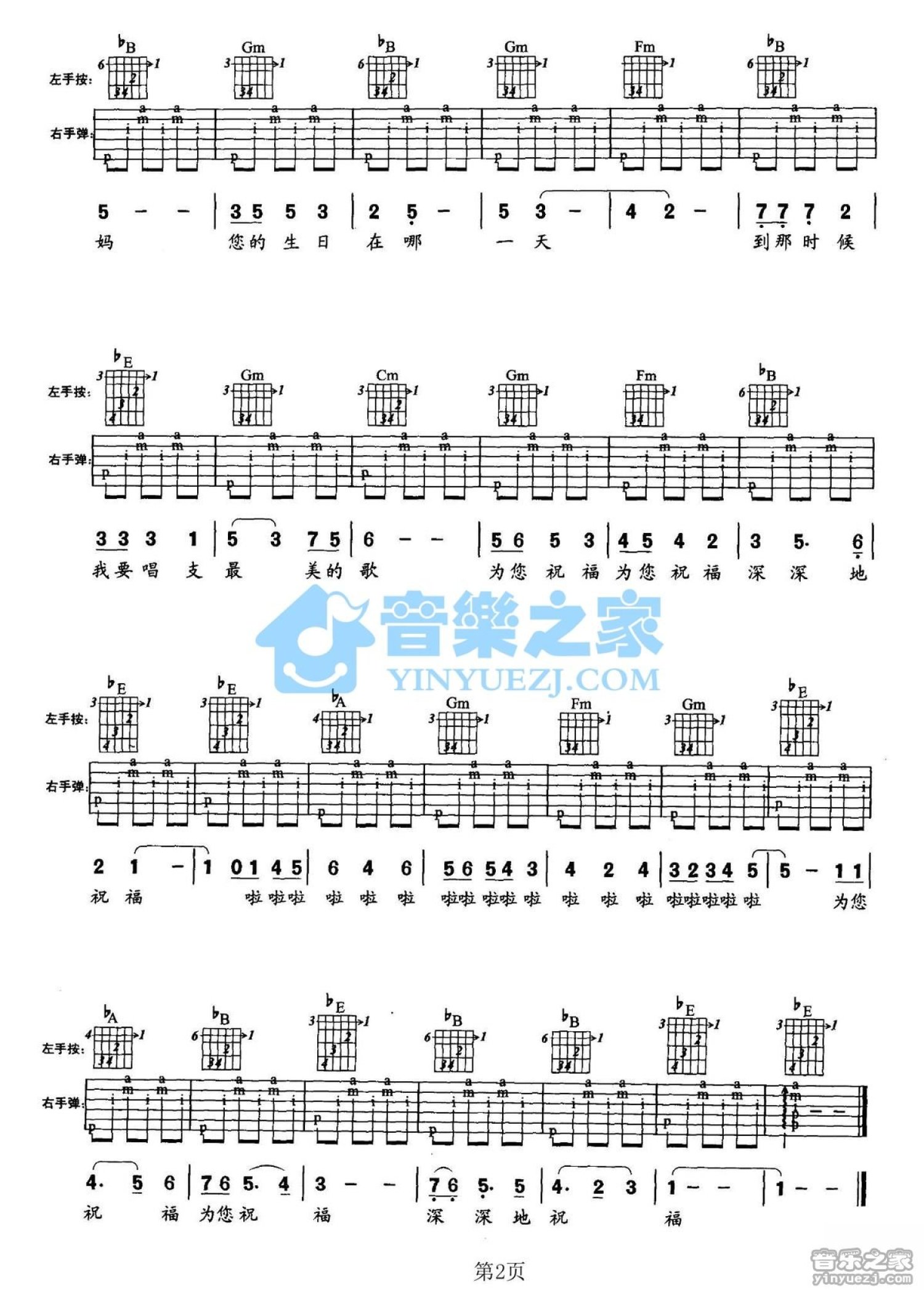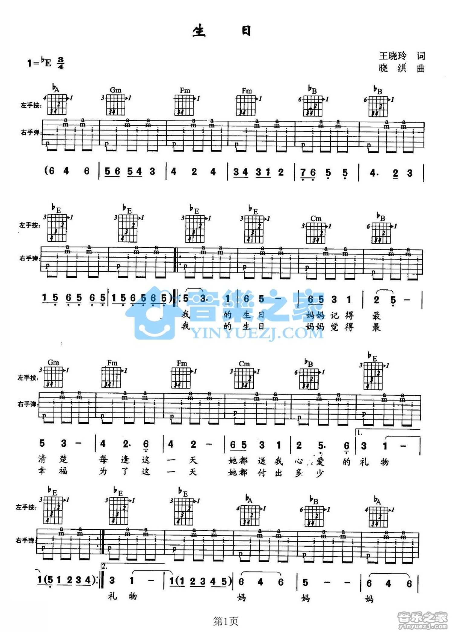 曲谱介绍: bE调版儿歌《生日》吉他弹唱六线谱