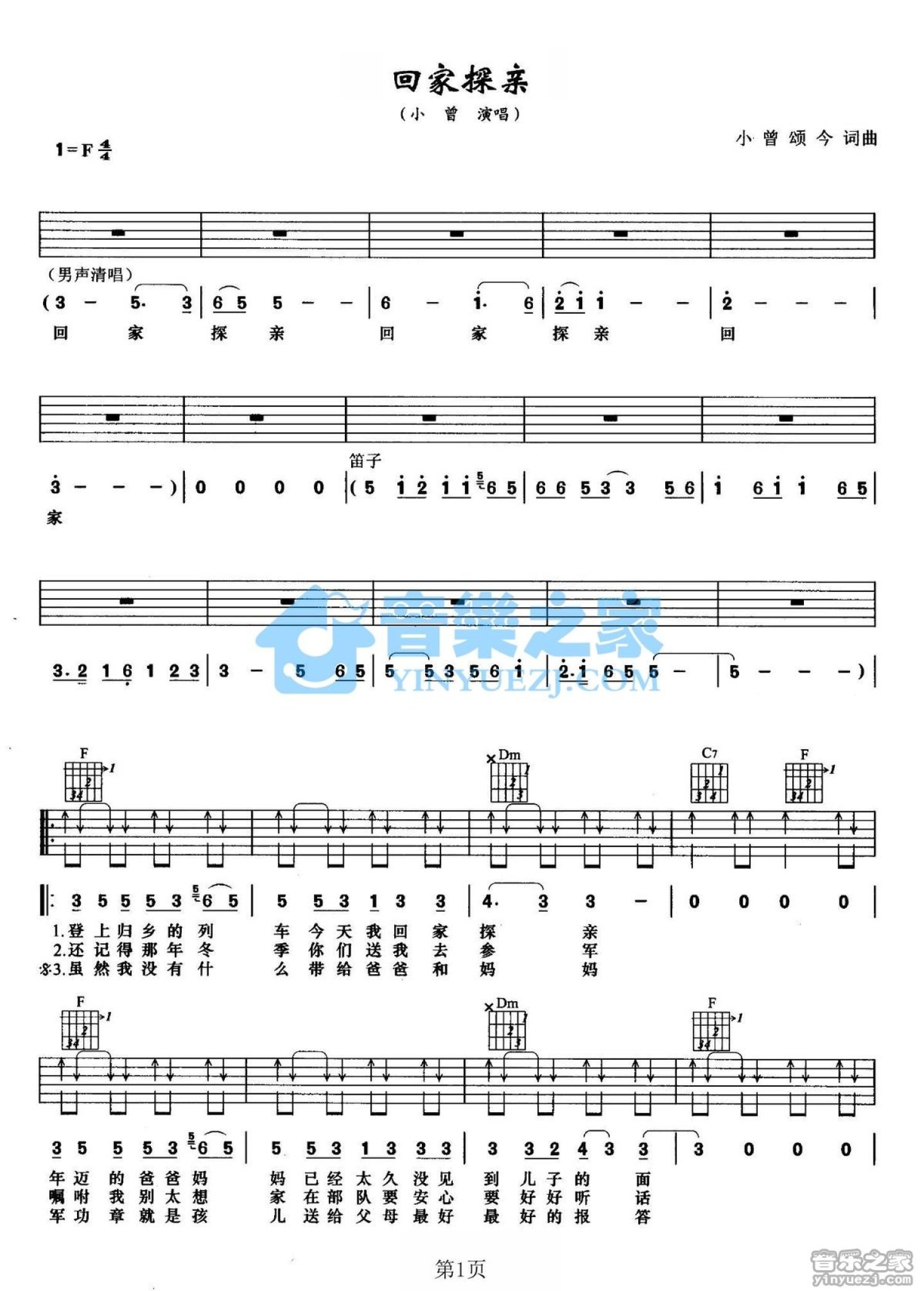 曲谱介绍: F调版小曾《回家探亲》吉他弹唱六线谱