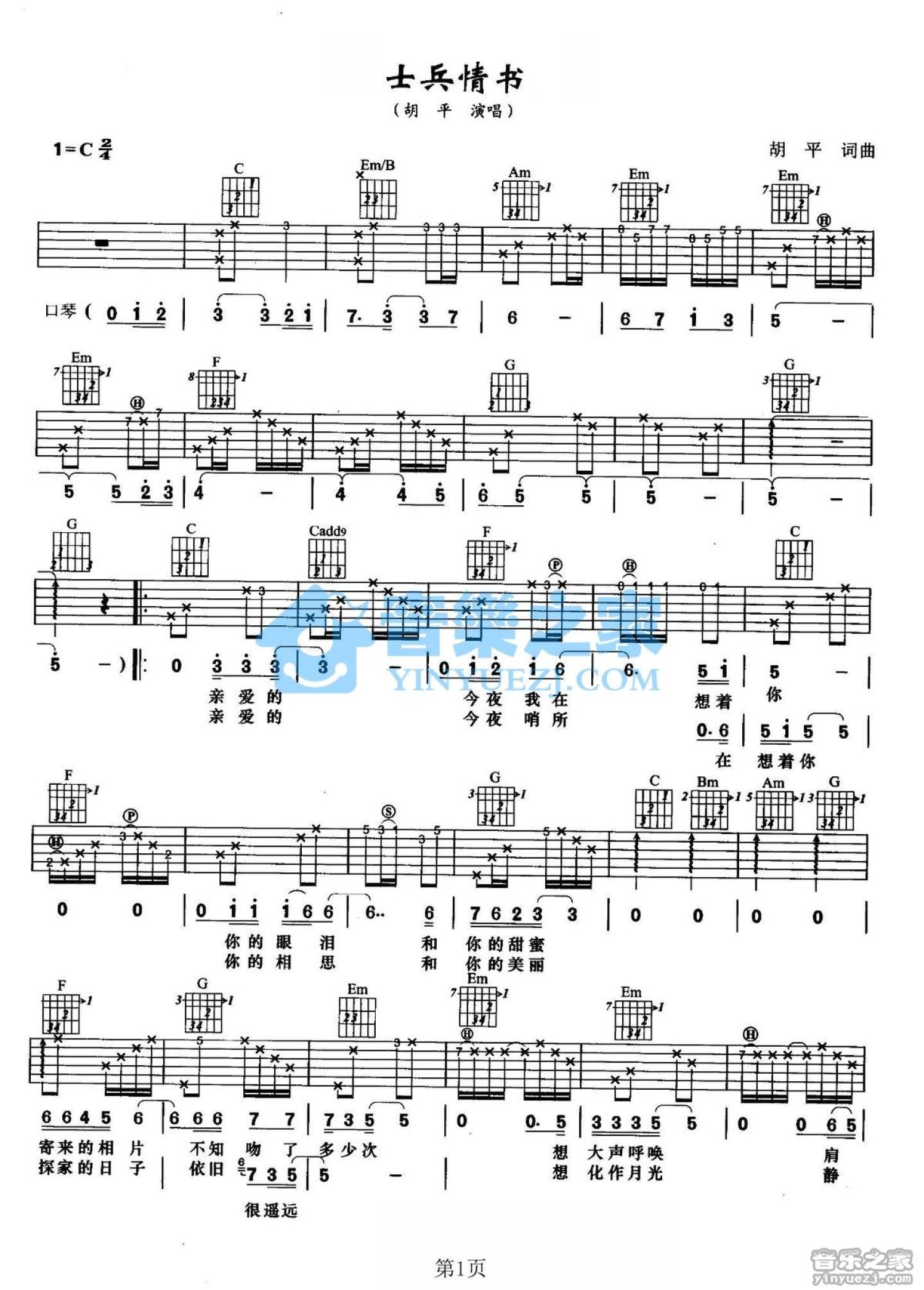 曲谱介绍: C调版胡平《士兵情书》吉他弹唱六线谱