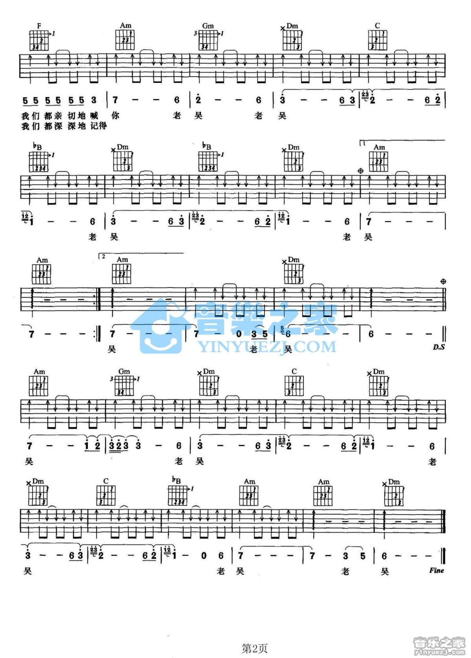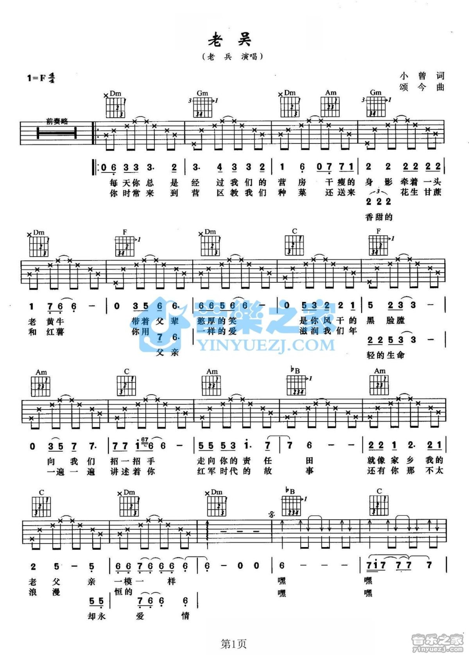 曲谱介绍: F调版老兵《老吴》吉他弹唱六线谱