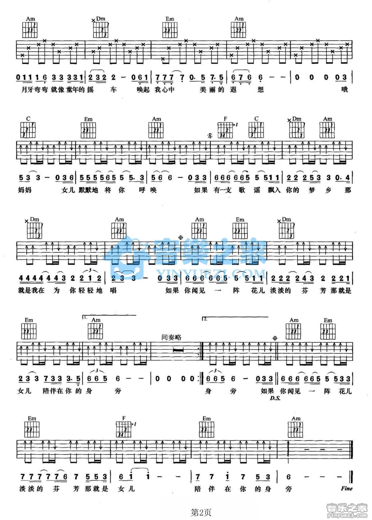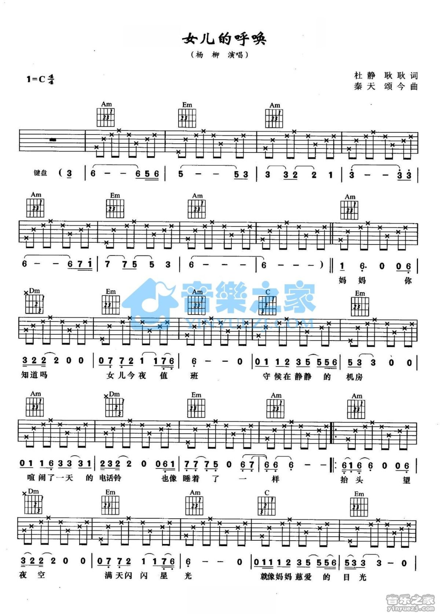 曲谱介绍: C调版杨柳《女儿的呼唤》吉他弹唱六线谱