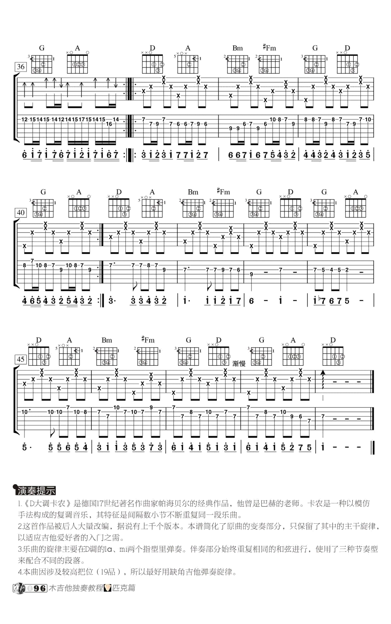曲谱介绍: D大调卡农是德国十七世纪著名作曲家帕海贝尔的经典作品,以模仿手法构成的复调音乐,其特征是间隔数小节不断重复同一段乐曲。这首作品被后人大量改编,本谱简化了原曲的变奏部分,只保留了其中的主干旋律以适应吉他爱好者的入门之需。乐曲的旋律主要在d调的LA、ML两个指型里弹奏。伴奏部分始终重复相同的和弦进行,使用了三种节奏型来配合不同的段落。本曲因涉及较高把位(十九品),所以最好用缺角吉他弹奏旋律。