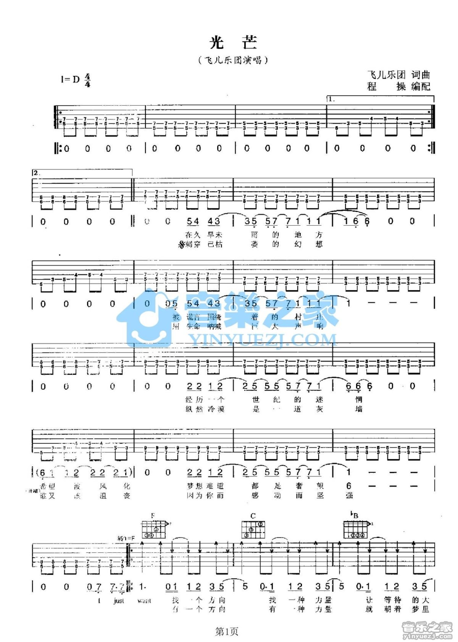 光芒吉他谱 - 飞儿乐队 - D调吉他弹唱谱