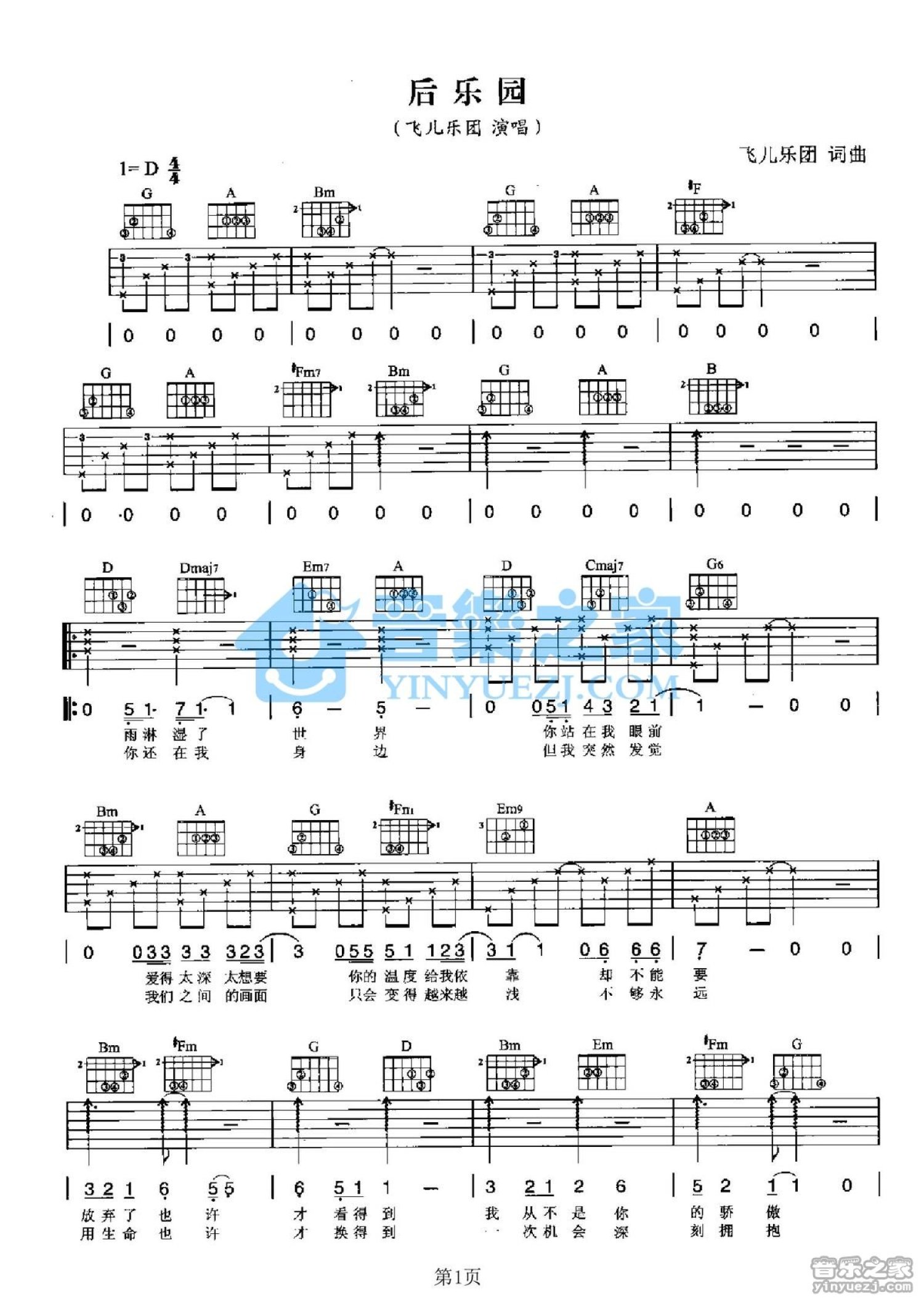 后乐园吉他谱 - 飞儿乐团 - D调吉他弹唱谱