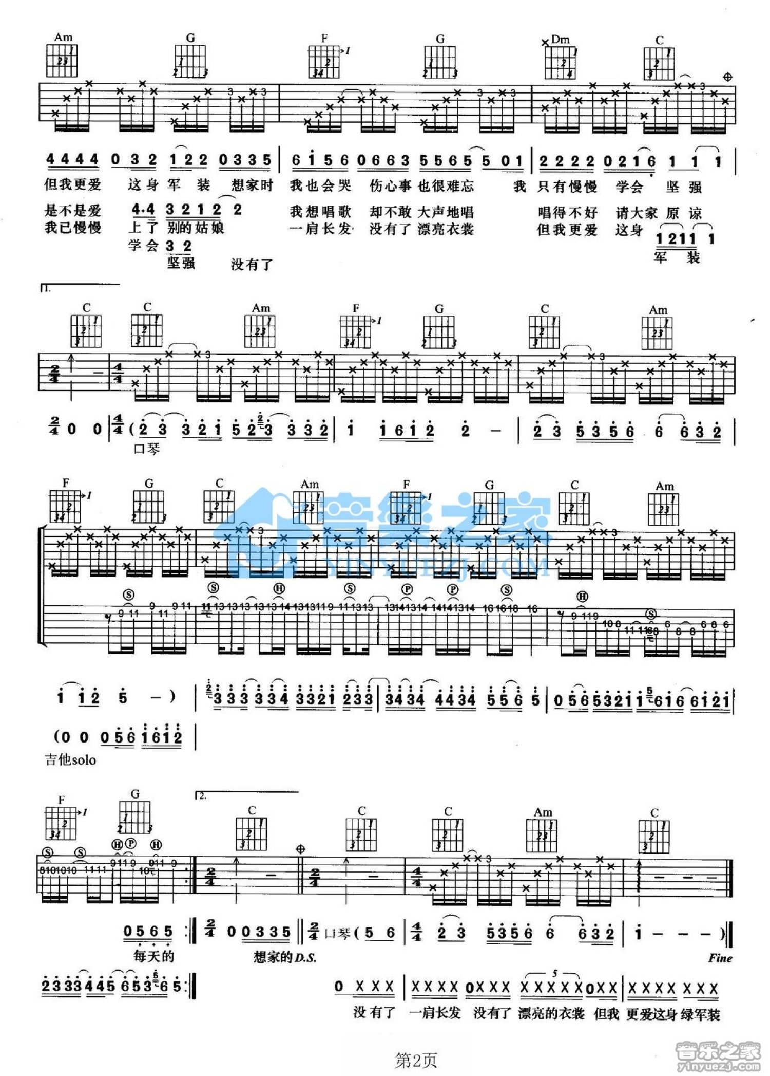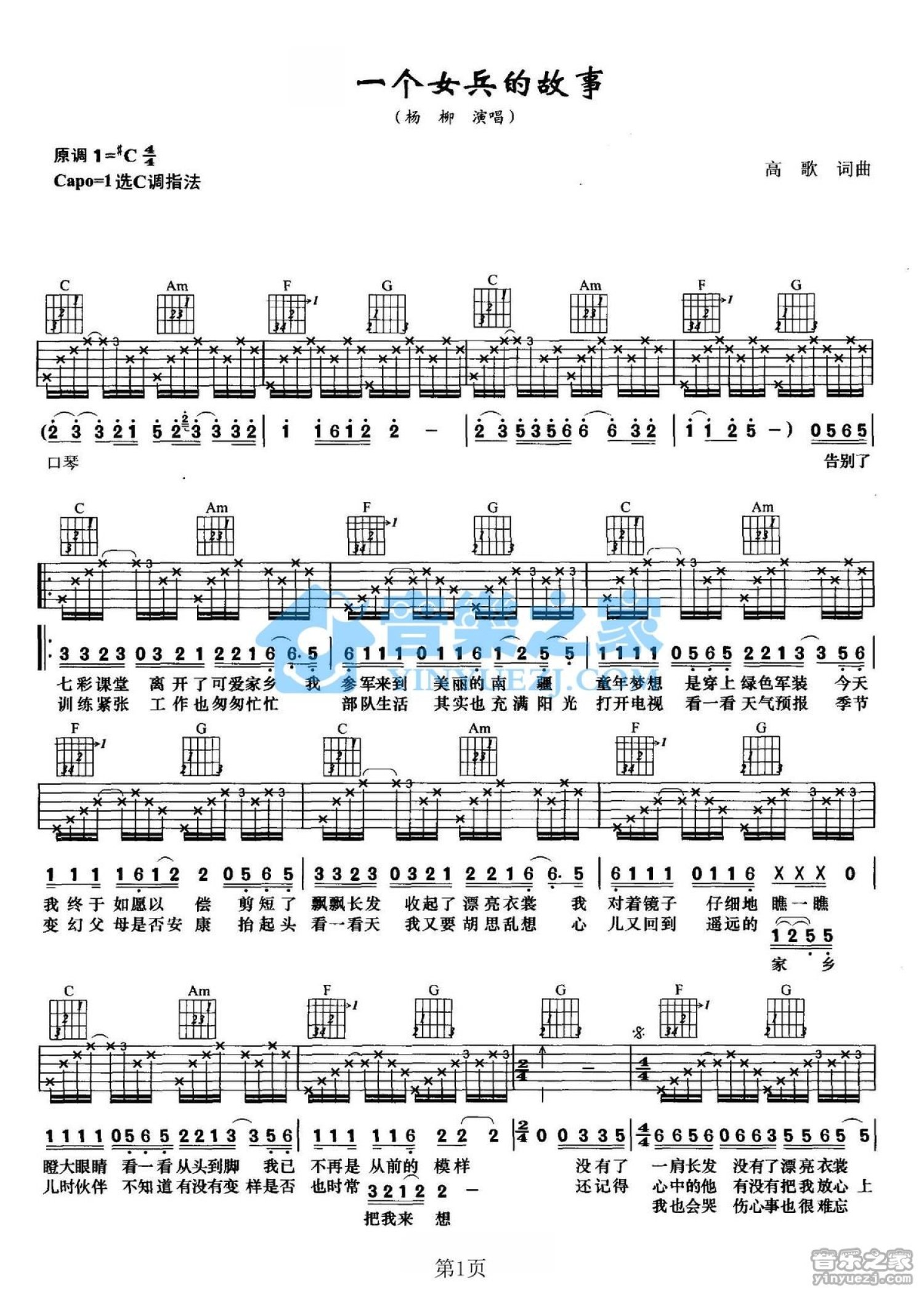 曲谱介绍: C调双吉他版杨柳《一个女兵的故事》吉他弹唱六线谱