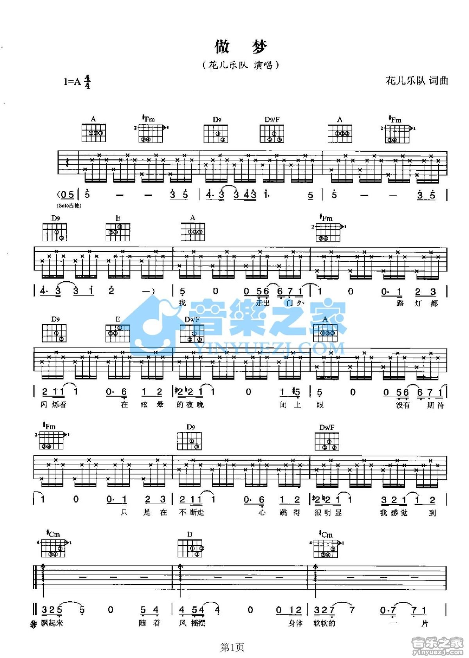 曲谱介绍: A调版花儿乐队《做梦》吉他弹唱六线谱