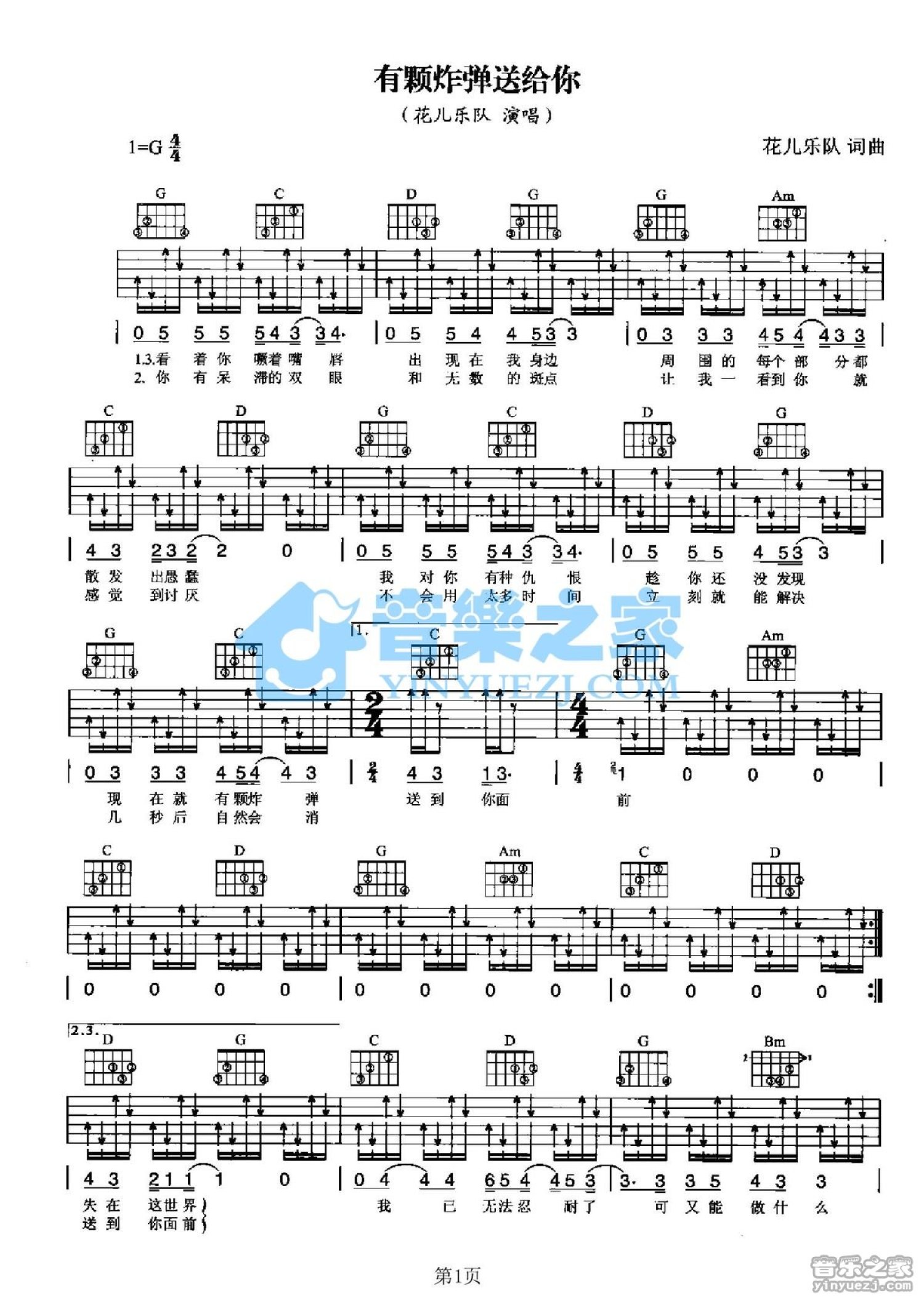 曲谱介绍: G调版花儿乐队《有颗炸弹送给你》吉他弹唱六线谱