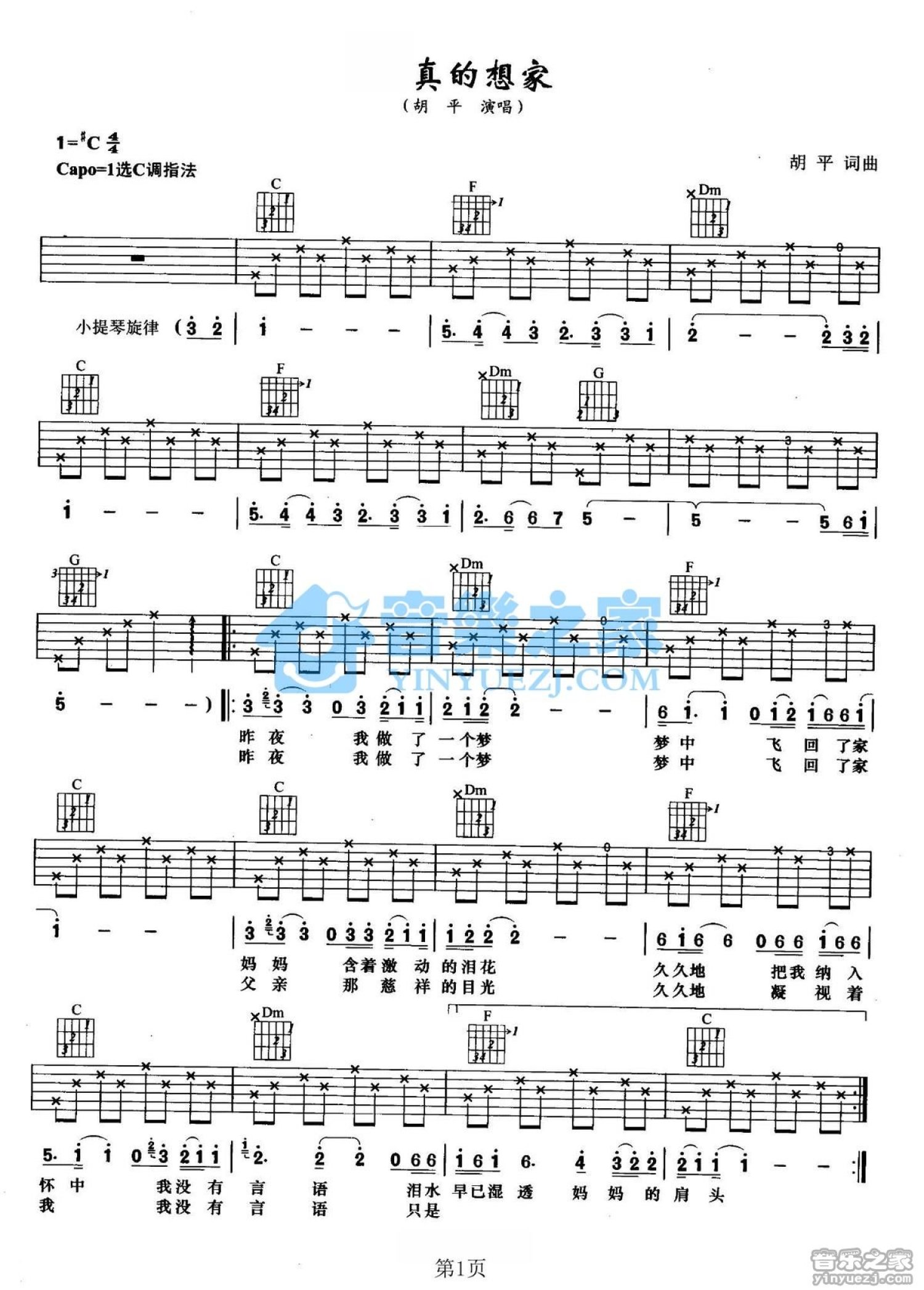 曲谱介绍: C调版胡平《真的想家》吉他弹唱六线谱
