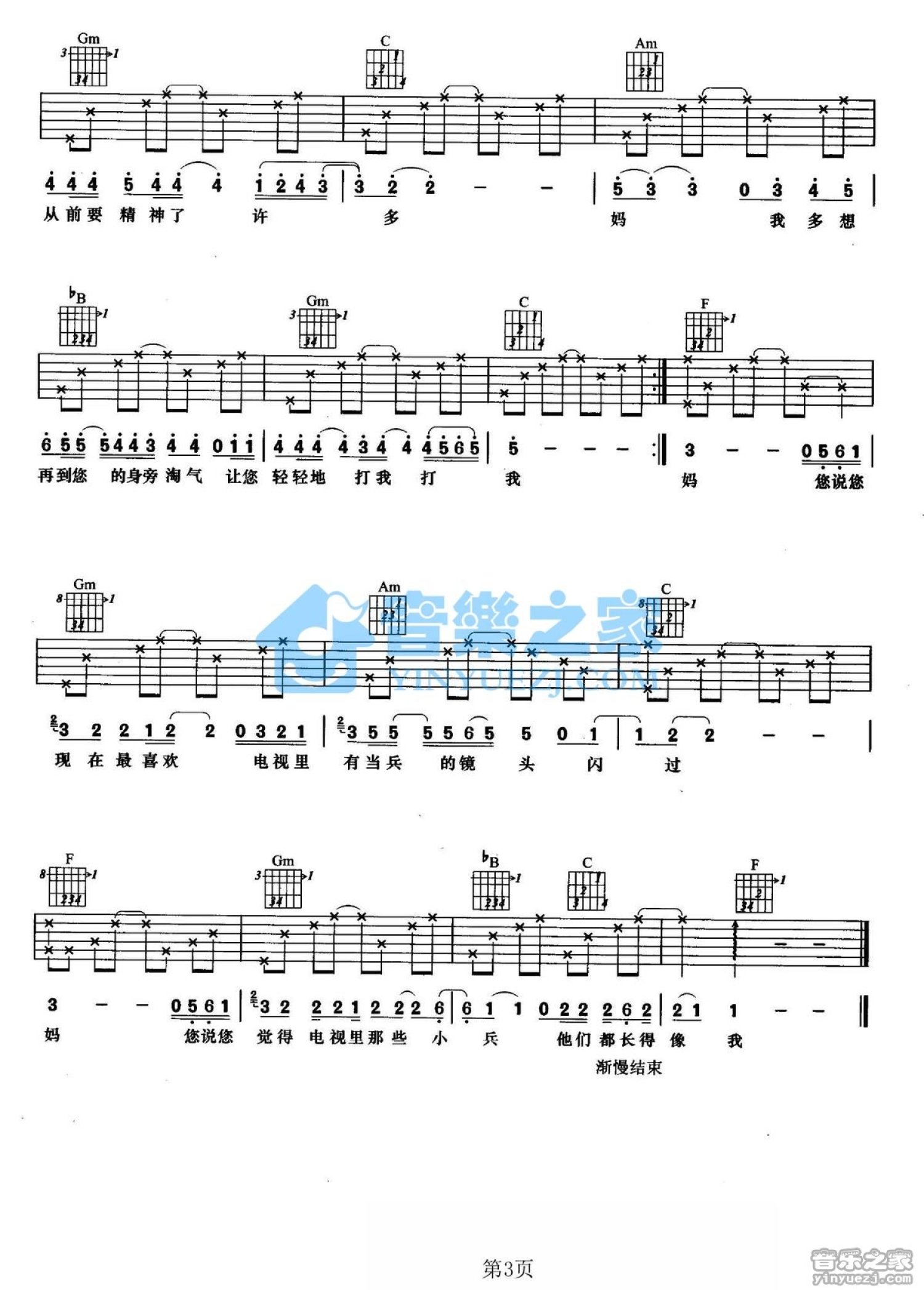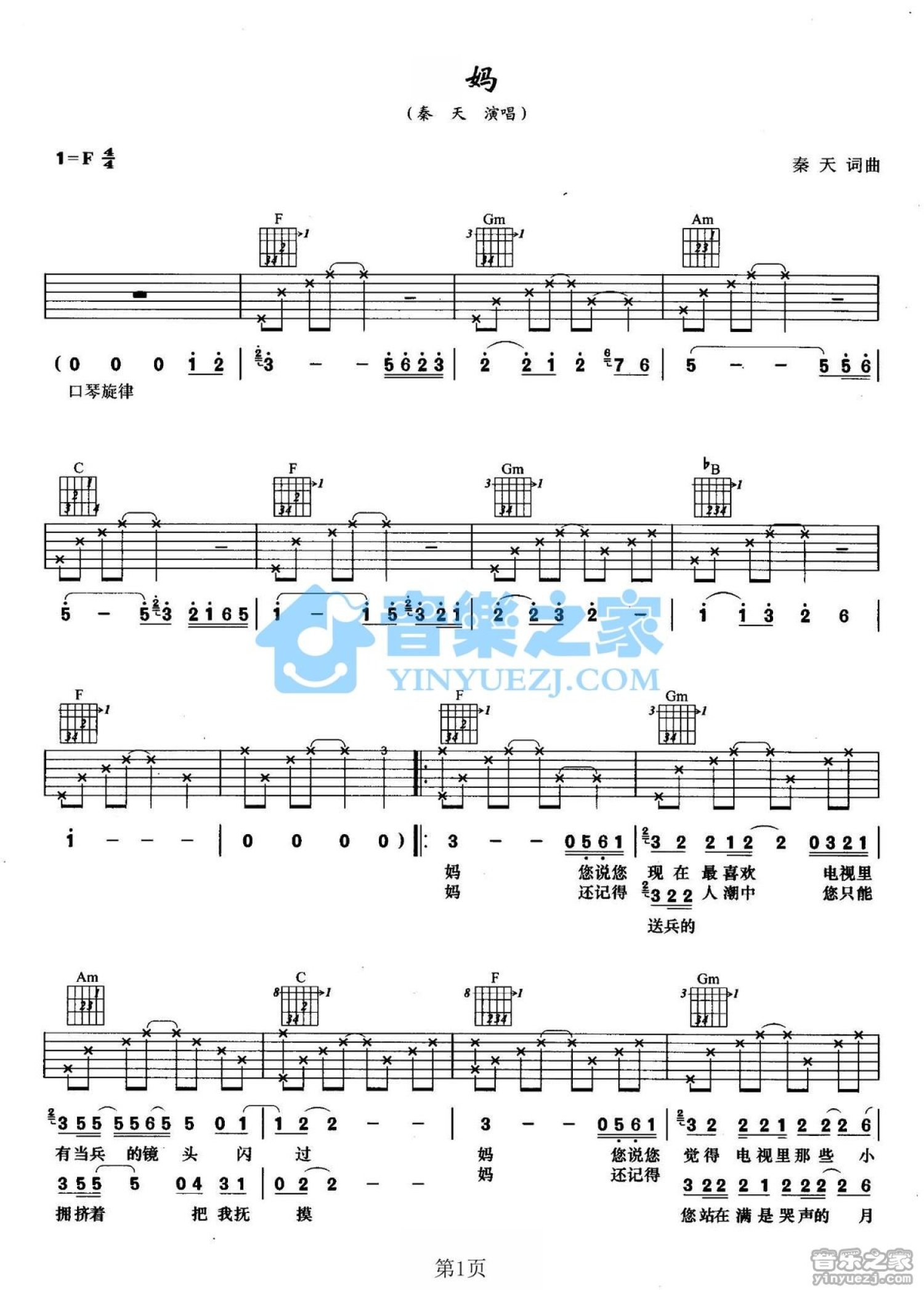 曲谱介绍: F调版秦天《妈》吉他弹唱六线谱