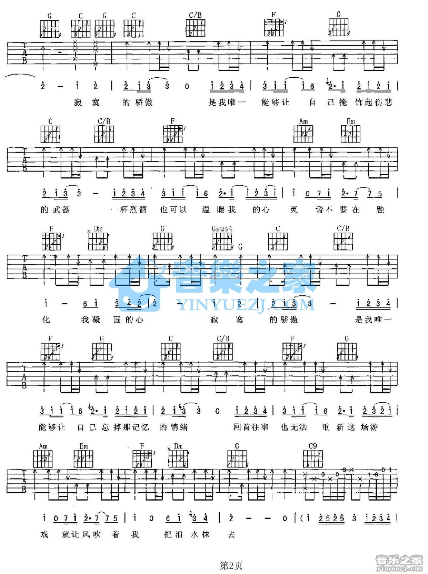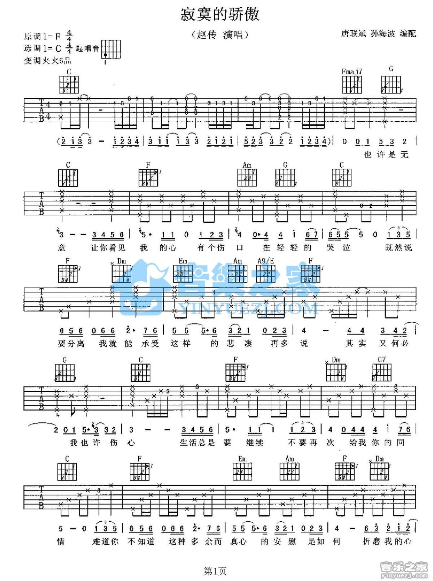 曲谱介绍: C调版赵传《寂寞的骄傲》吉他弹唱六线谱