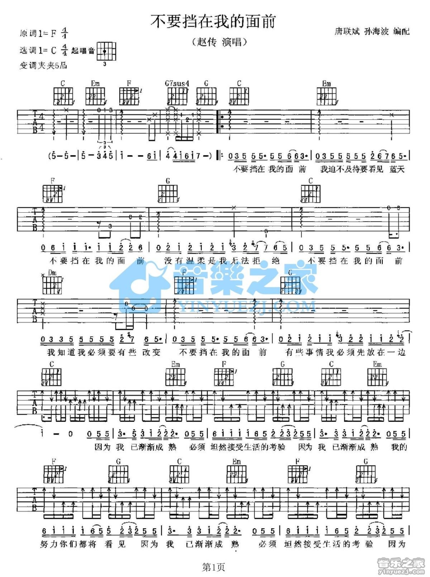 曲谱介绍: C调版赵传《不要挡在我的面前》吉他弹唱六线谱
