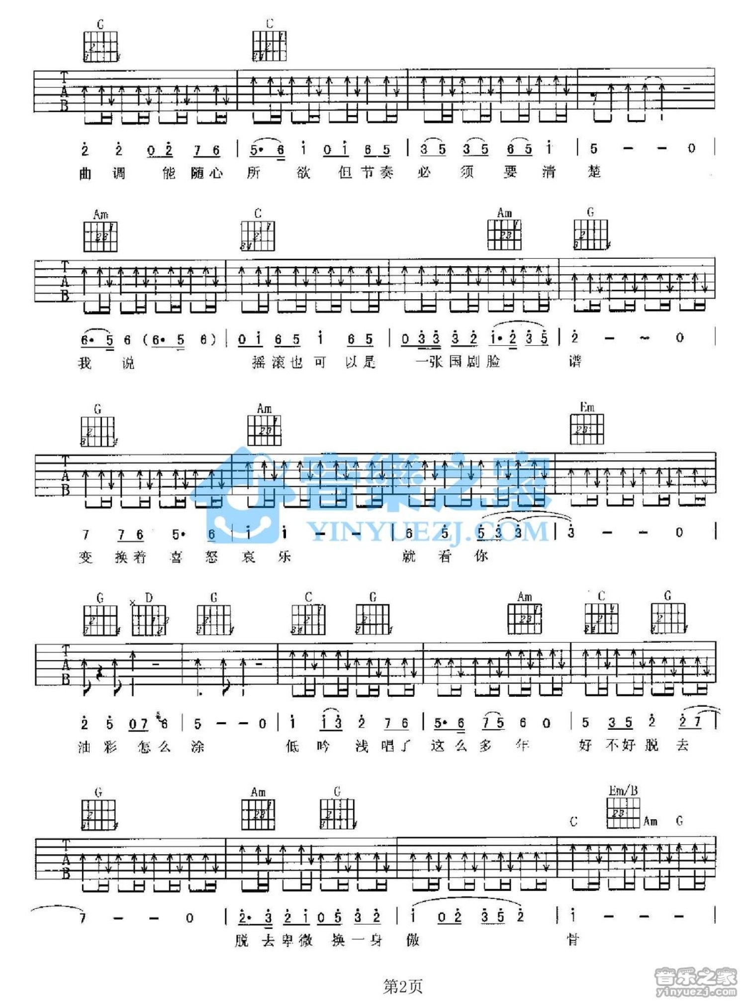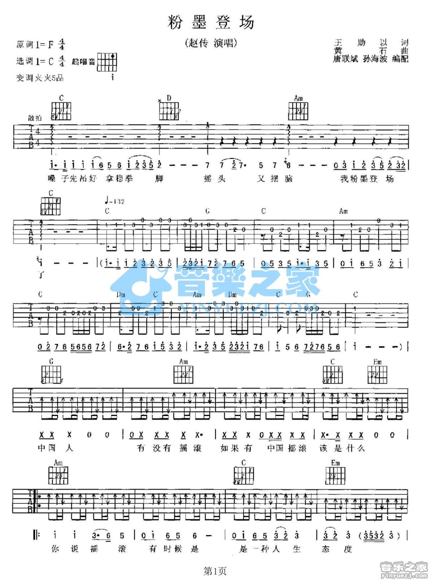 曲谱介绍: C调版赵传《粉墨登场》吉他弹唱六线谱