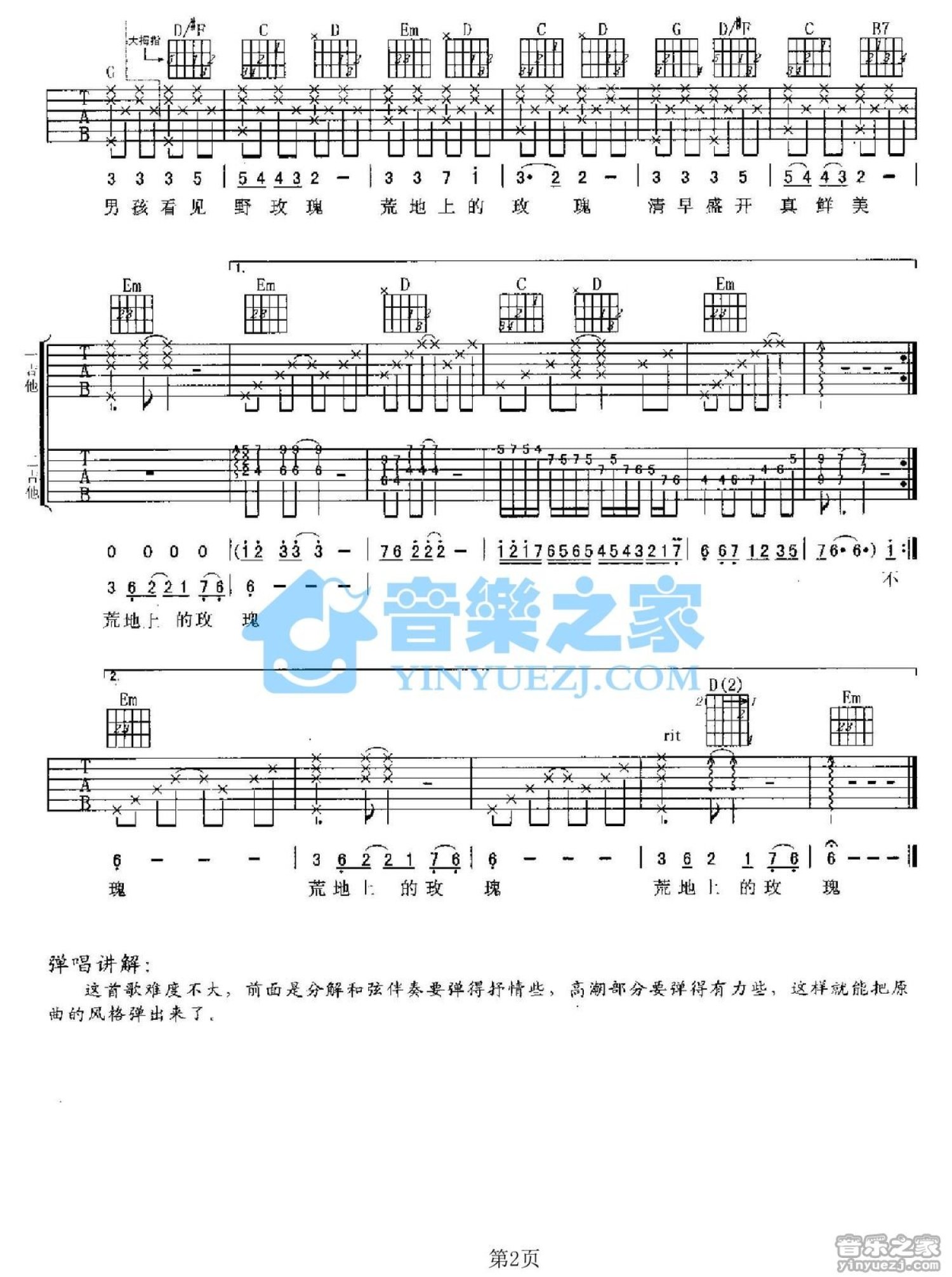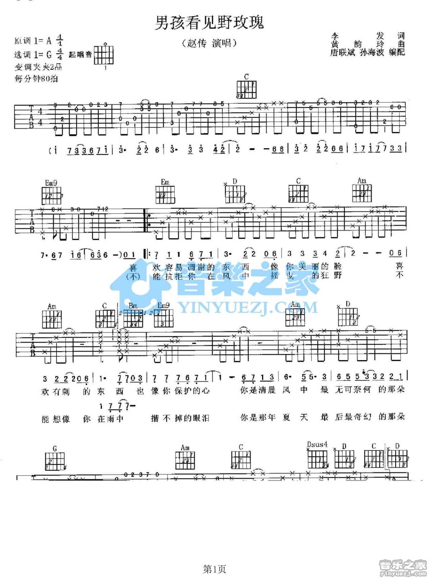 曲谱介绍: G调双吉他版赵传《男孩看见野玫瑰》吉他弹唱六线谱