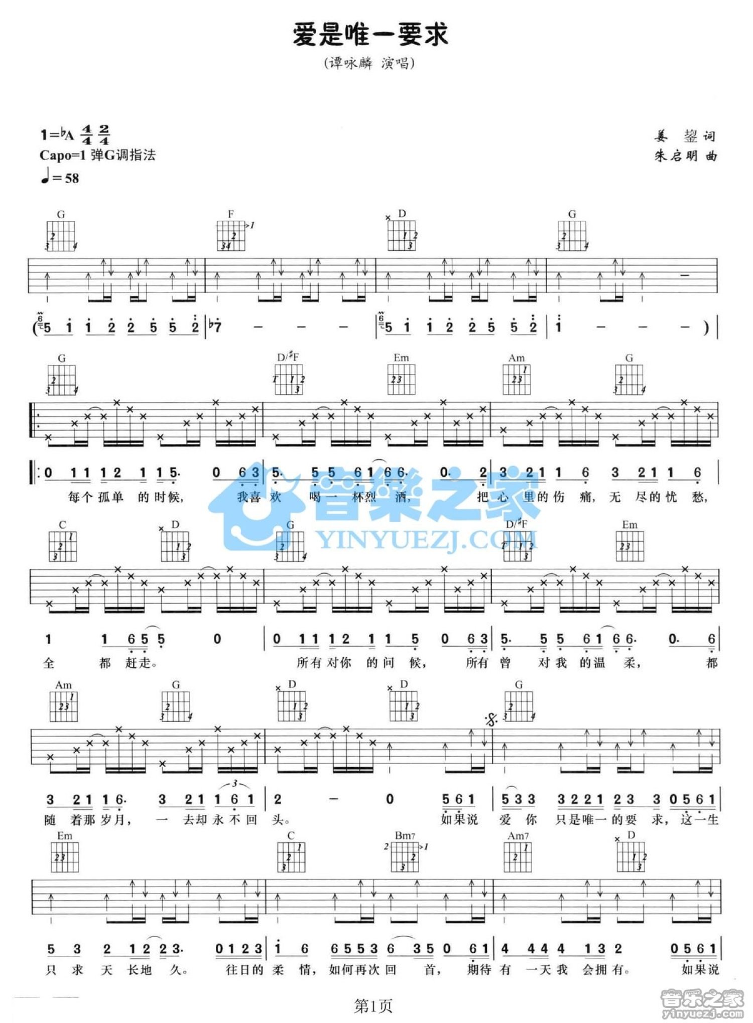 曲谱介绍: G调《爱是唯一要求》吉他弹唱六线谱