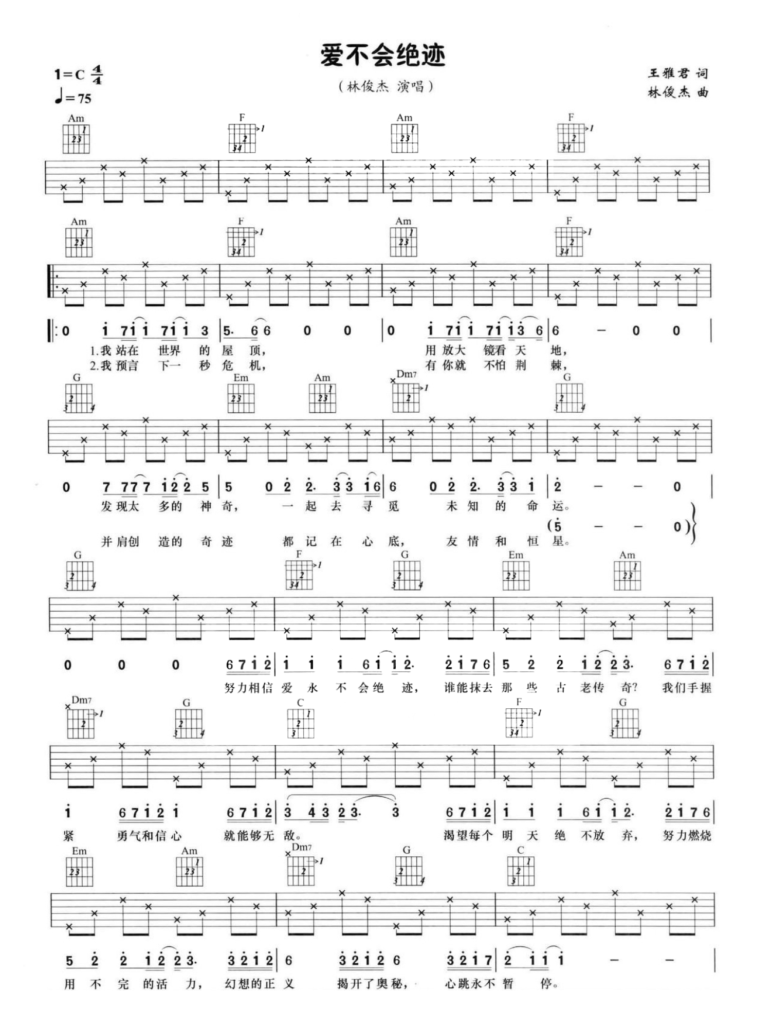 曲谱介绍: C调简单版林俊杰《爱不会绝迹》吉他弹唱六线谱