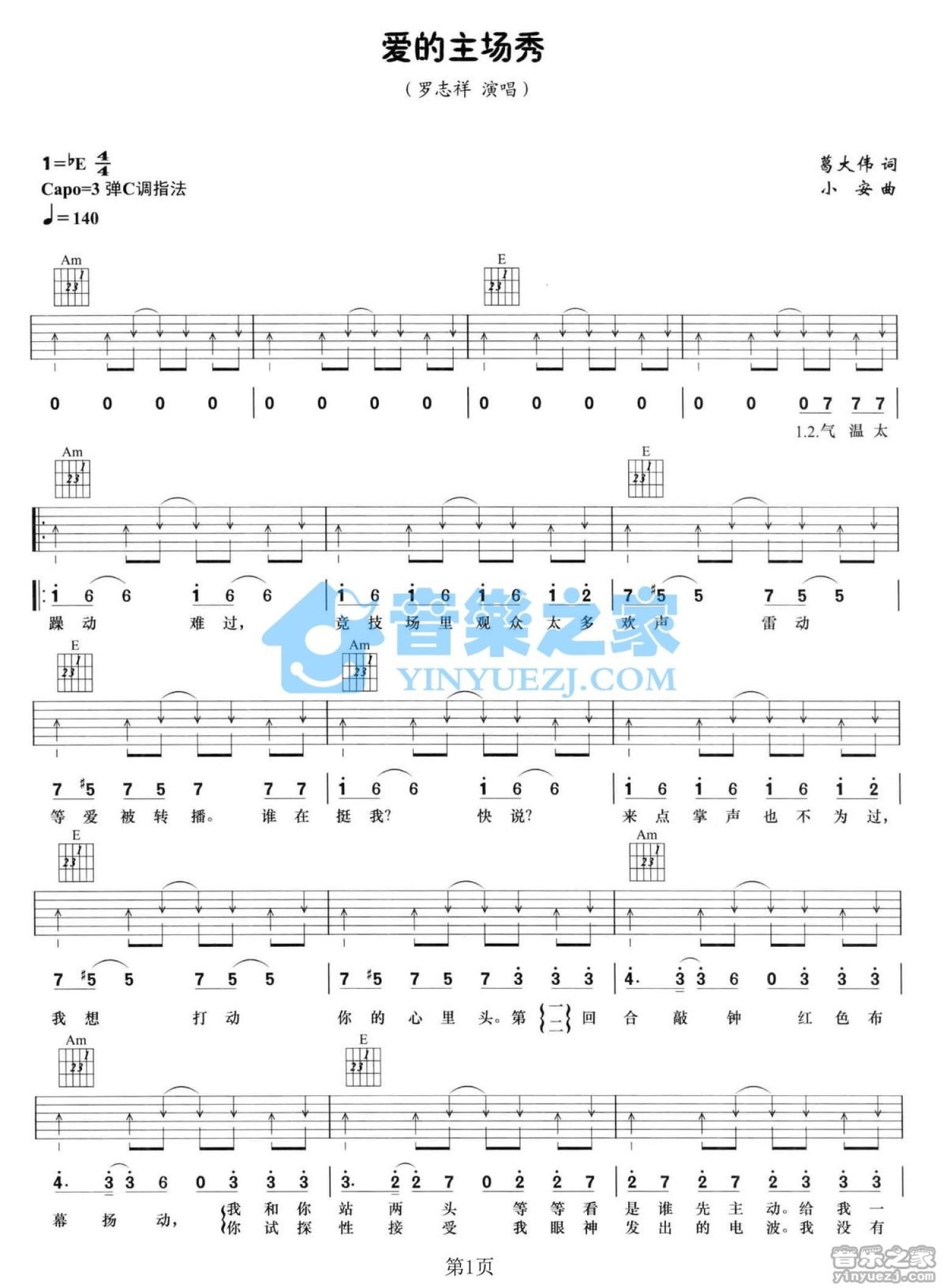 曲谱介绍: C调版罗志祥《爱的主秀场》吉他弹唱六线谱