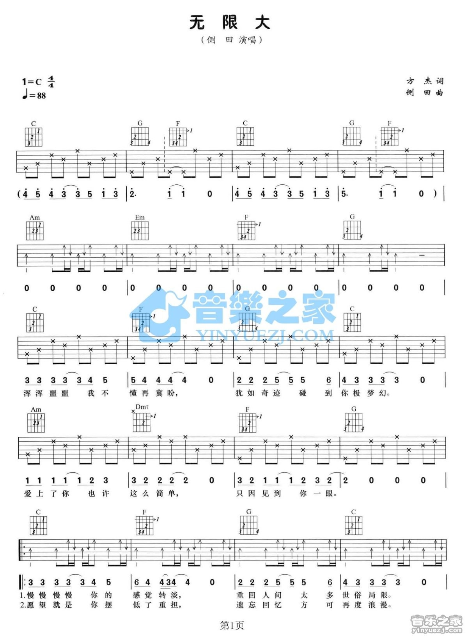 曲谱介绍: C调简单版侧田《无限大》吉他弹唱六线谱