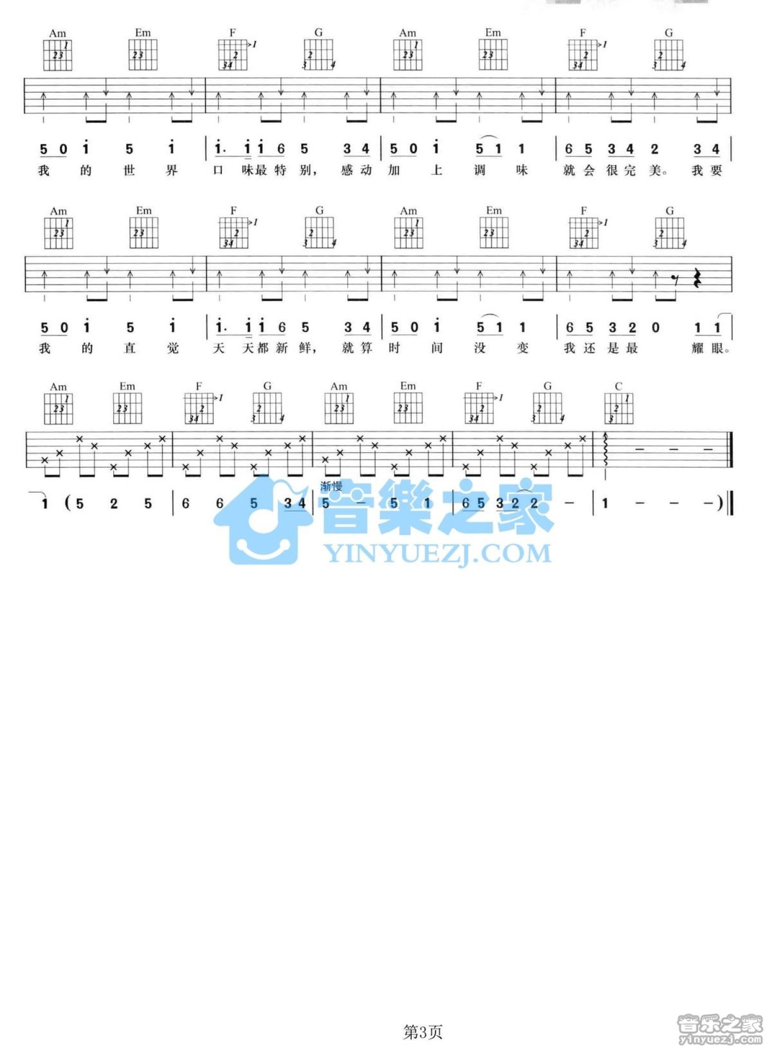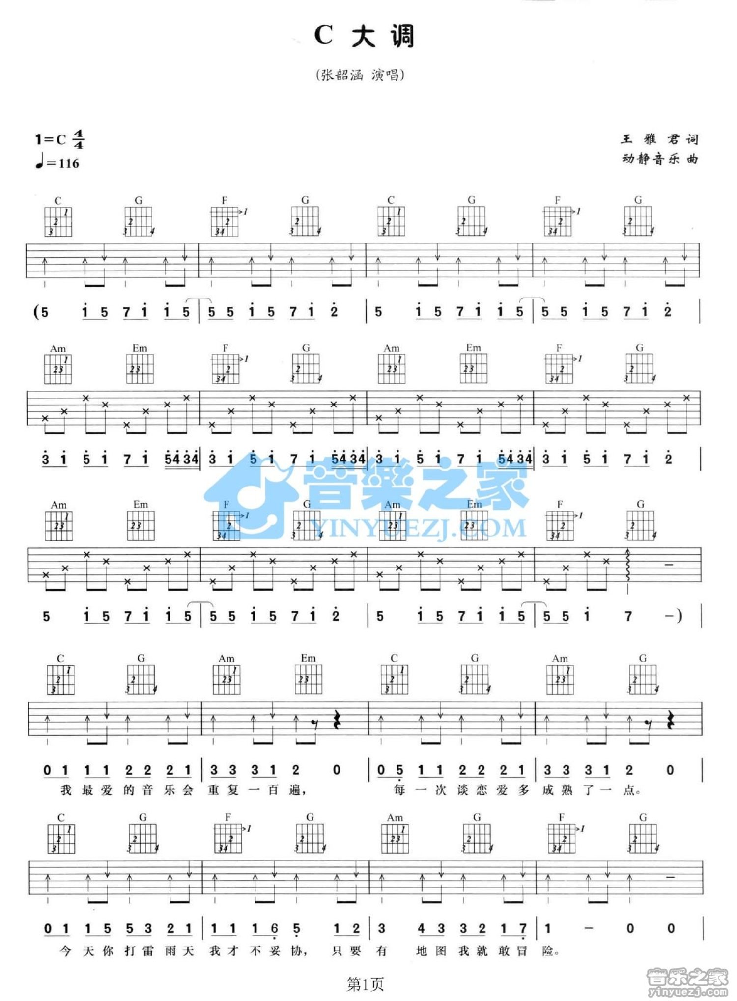 曲谱介绍: C调版张韶涵《C大调》吉他弹唱六线谱