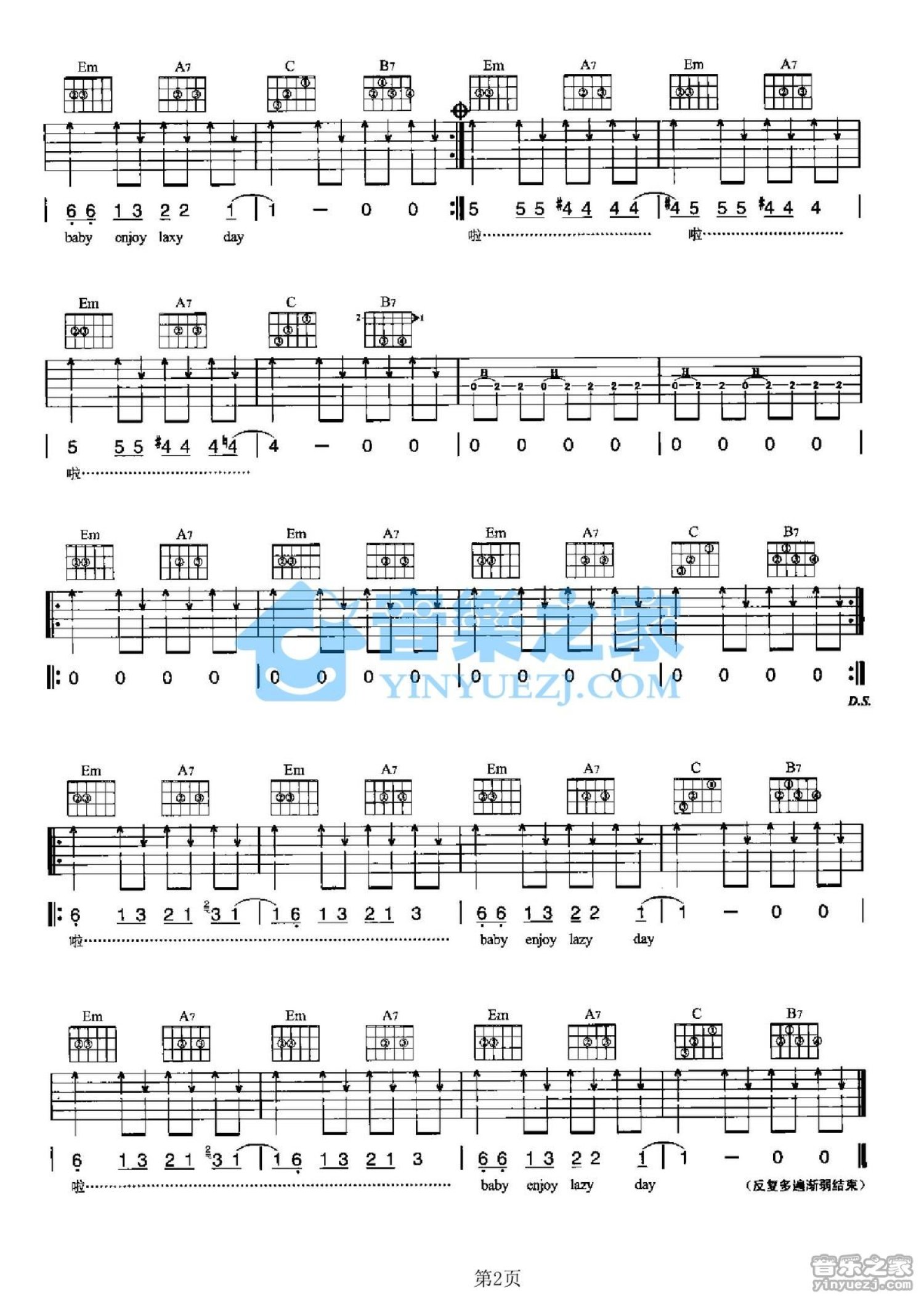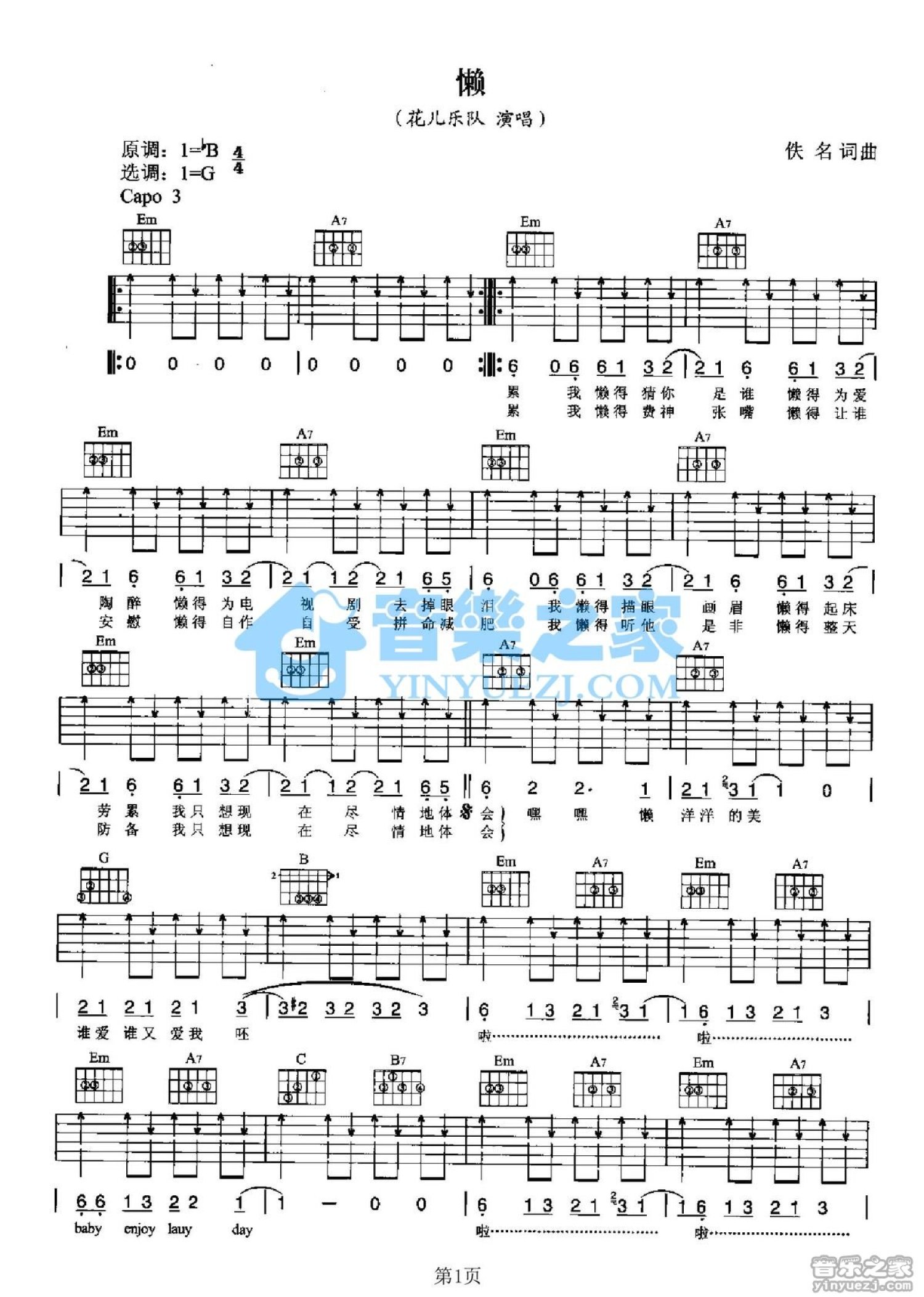 曲谱介绍: G调版花儿乐队《懒》吉他弹唱六线谱