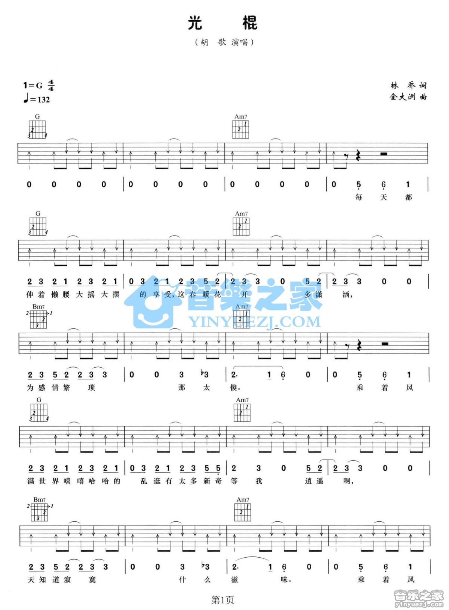 曲谱介绍: G调高清版胡歌《光棍》吉他弹唱六线谱