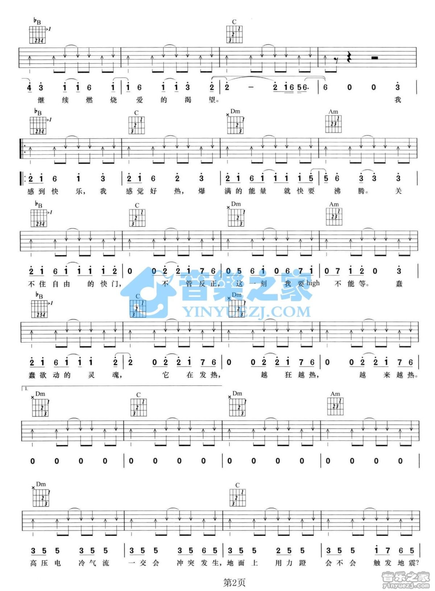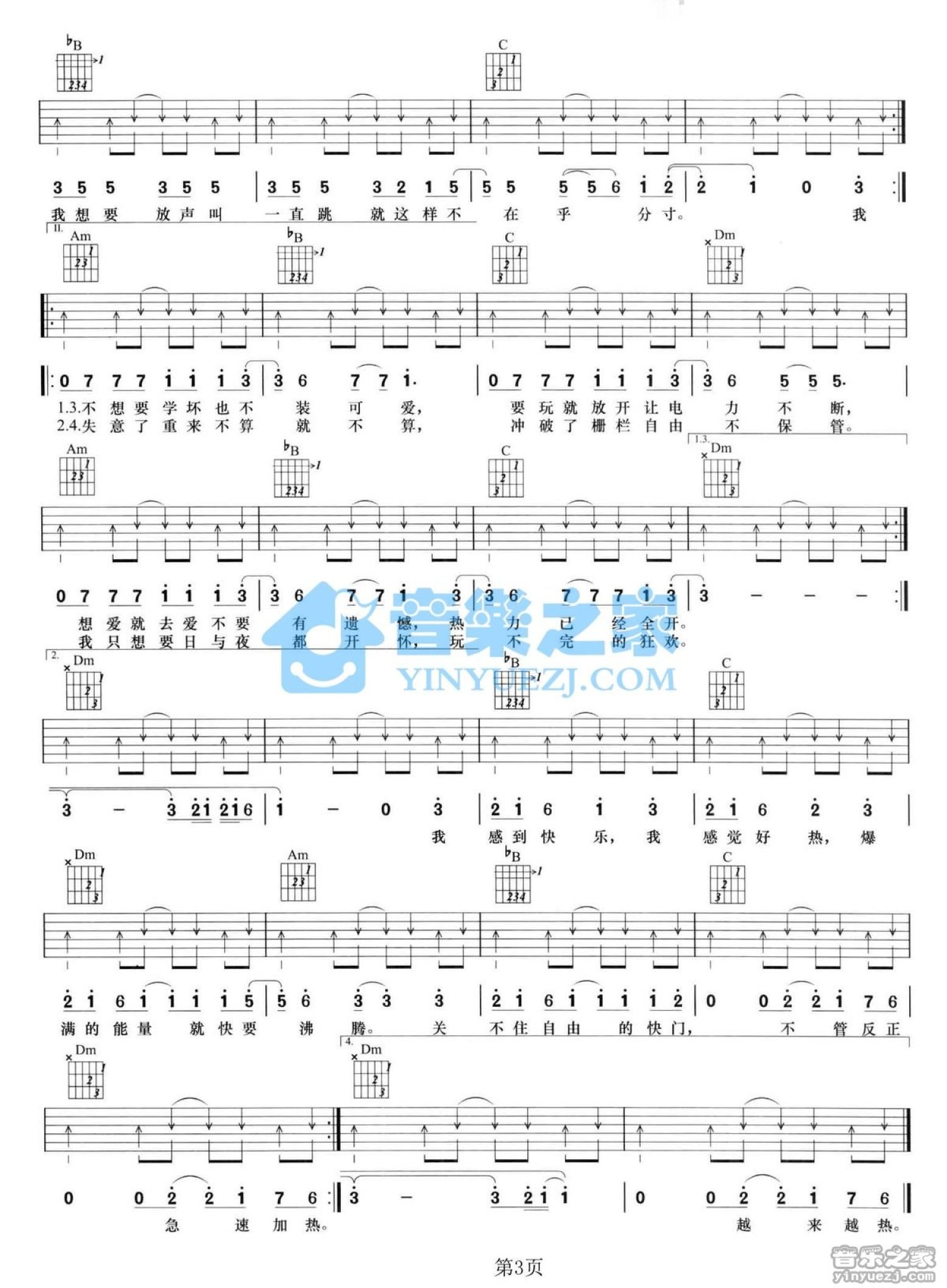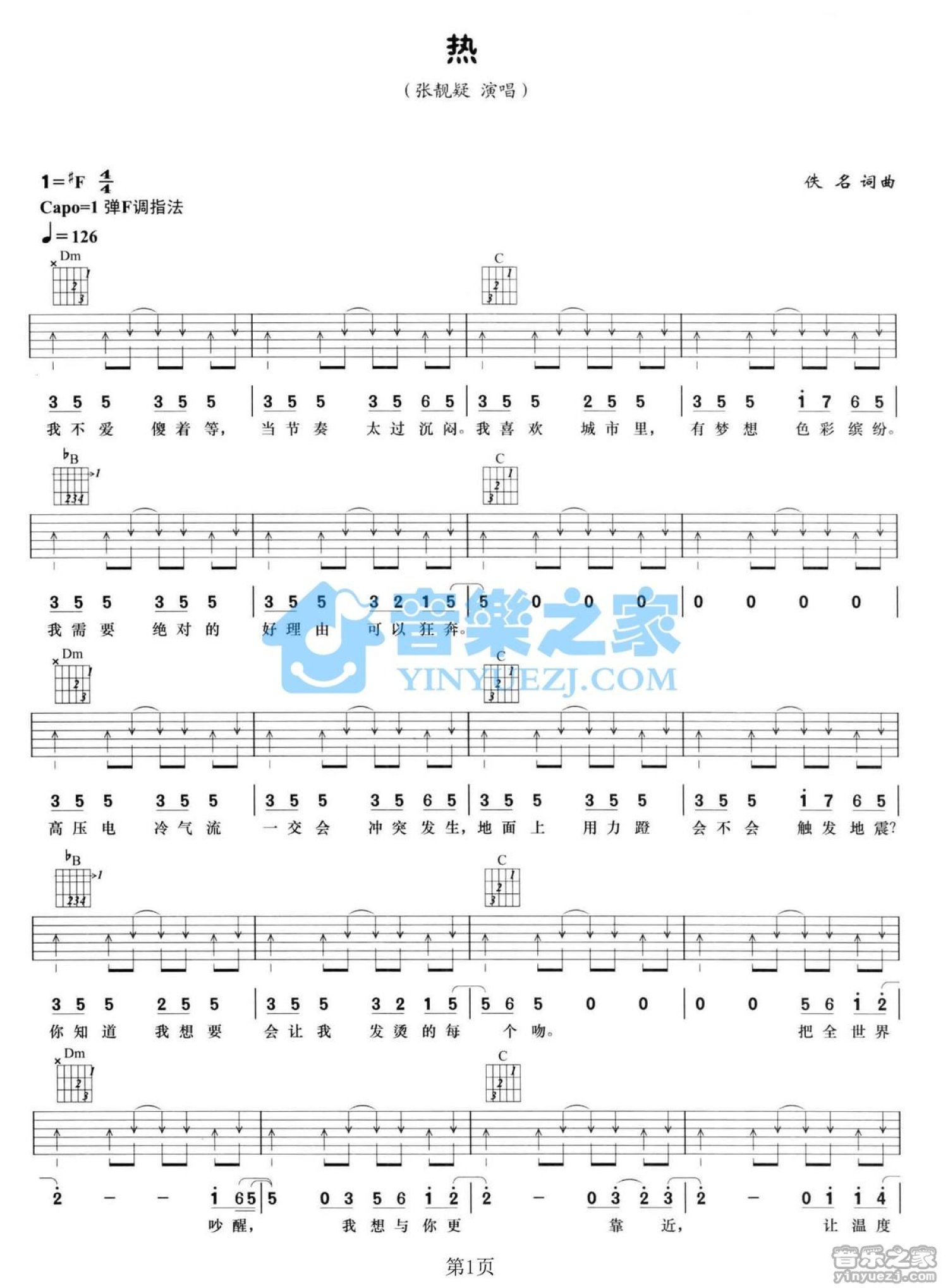 曲谱介绍: F调版张靓颖《热》吉他弹唱六线谱