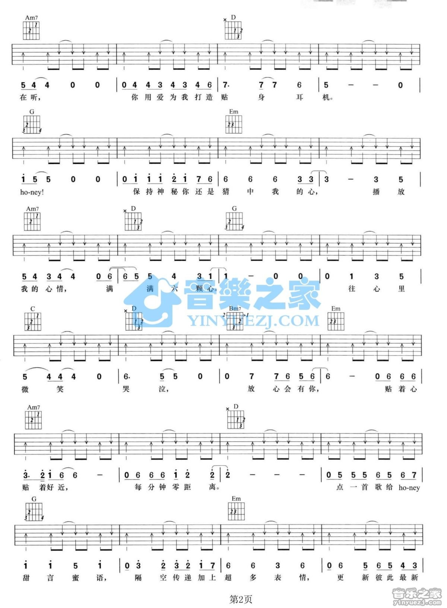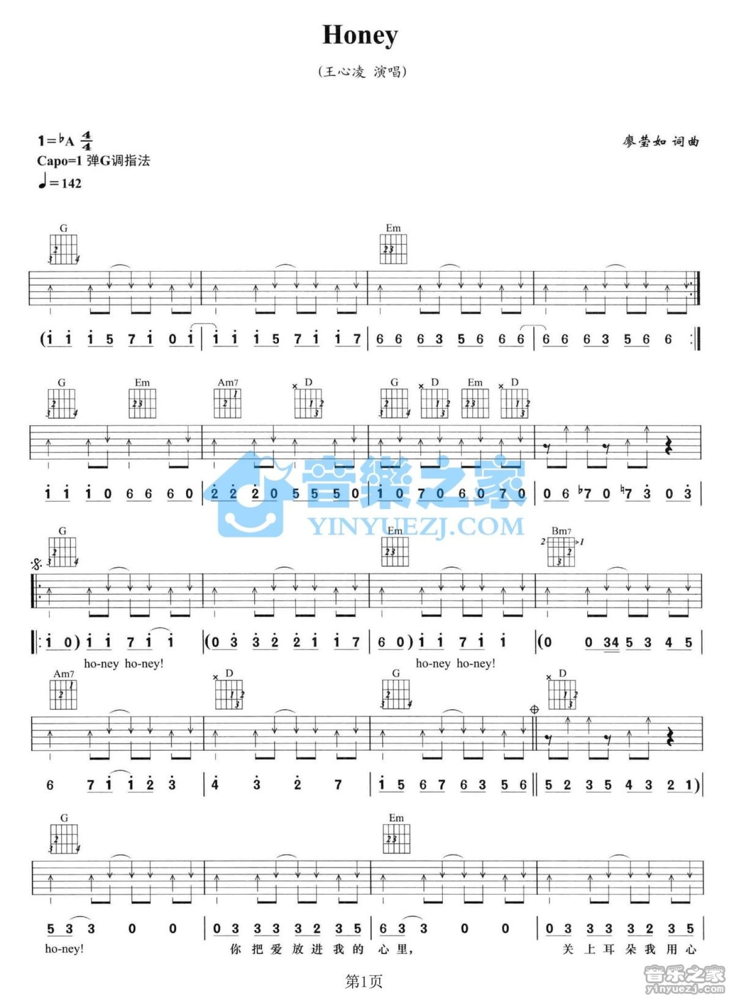 曲谱介绍: G调简单版王心凌《Honey》吉他弹唱六线谱