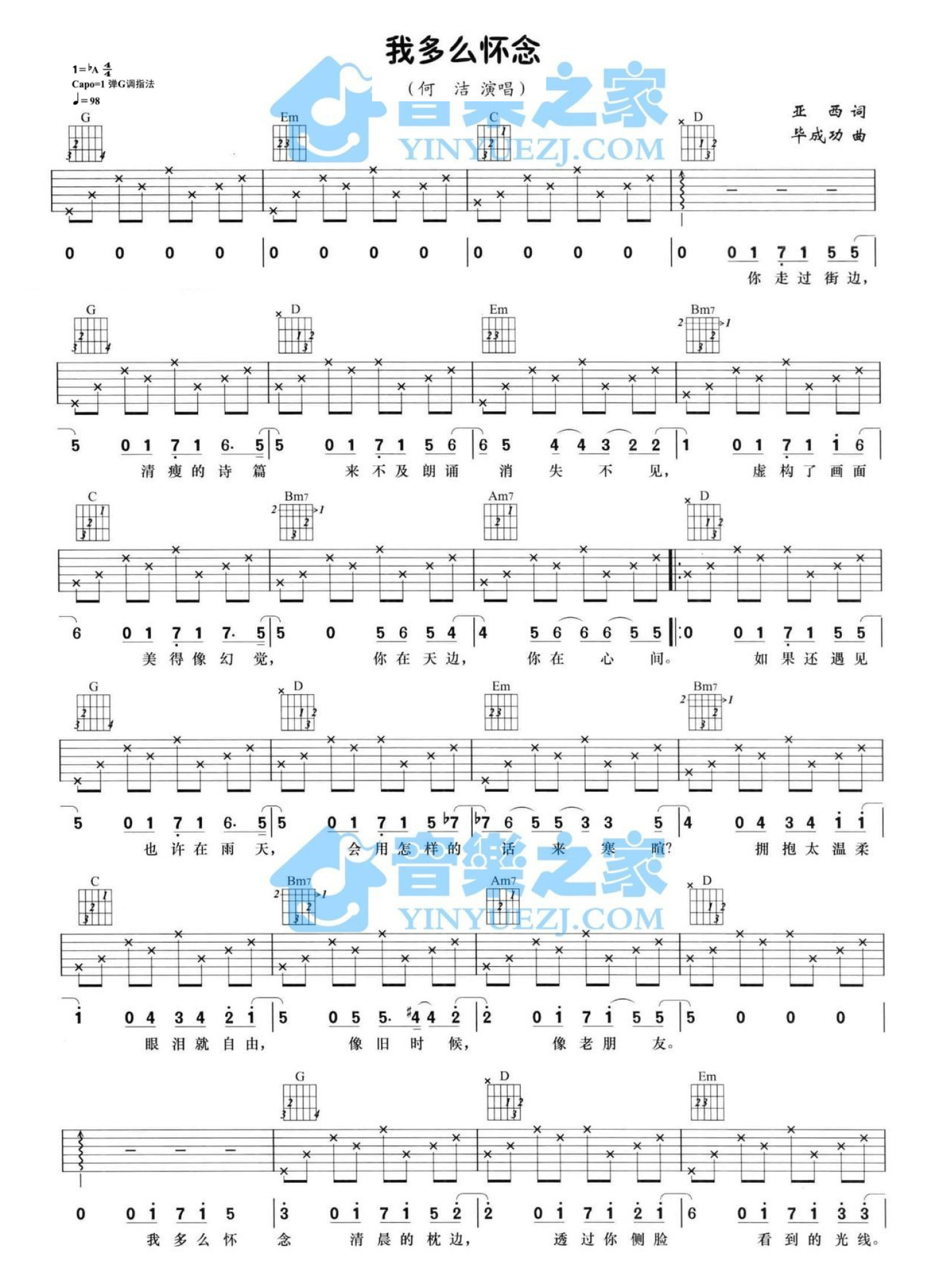 曲谱介绍: G调版何洁《我多么怀念》吉他弹唱六线谱