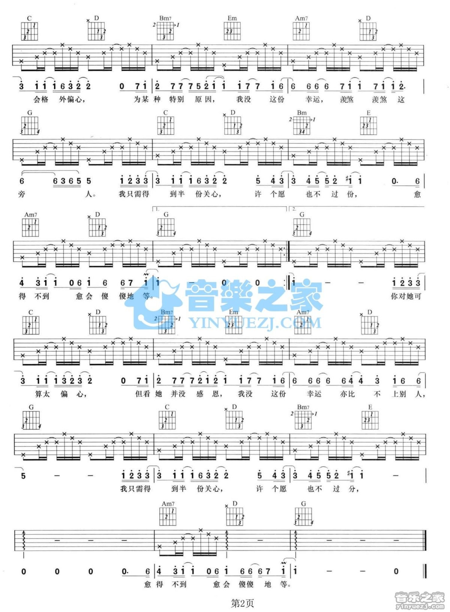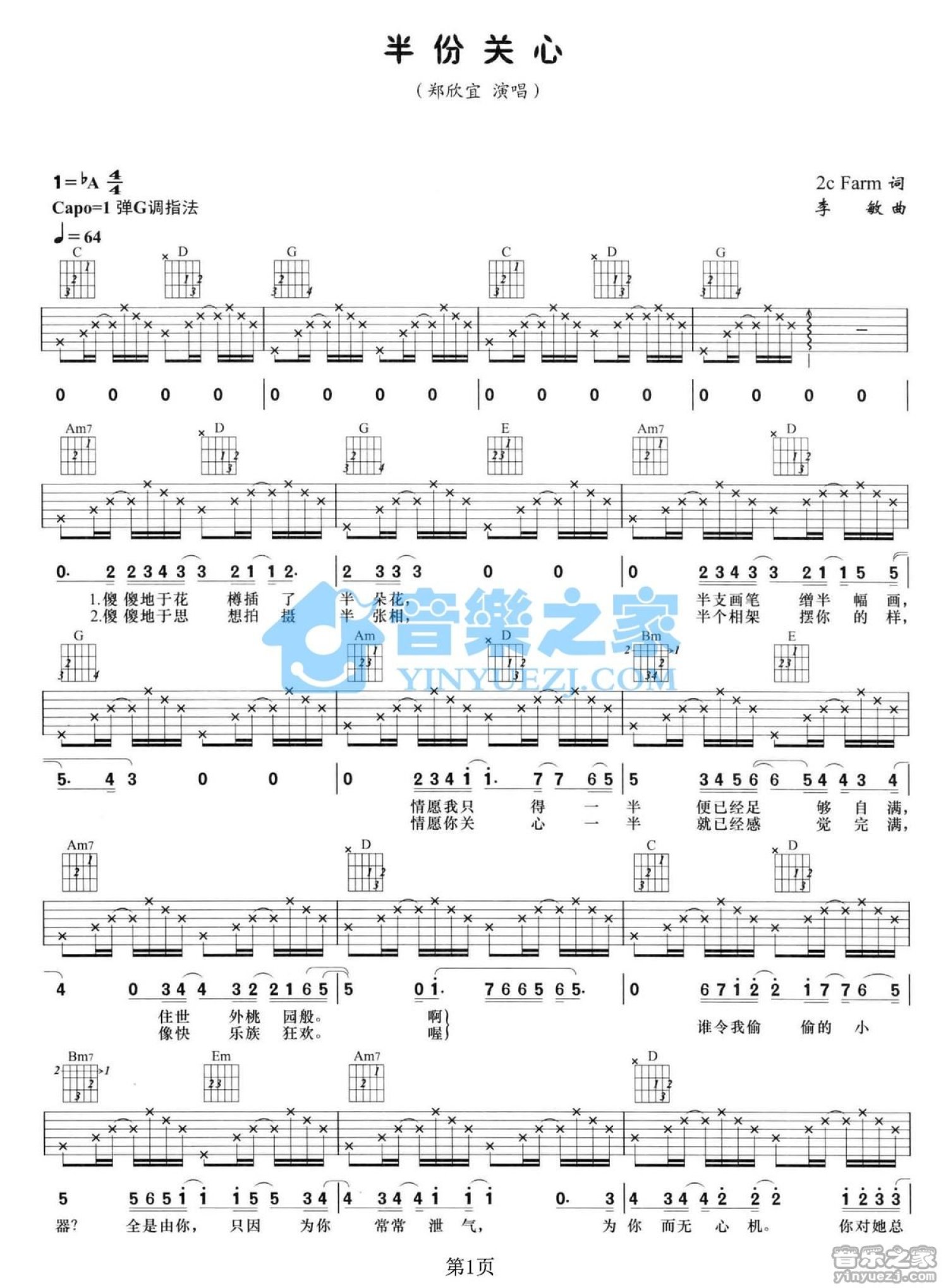 曲谱介绍: G调版郑欣宜《半份关心》吉他弹唱六线谱