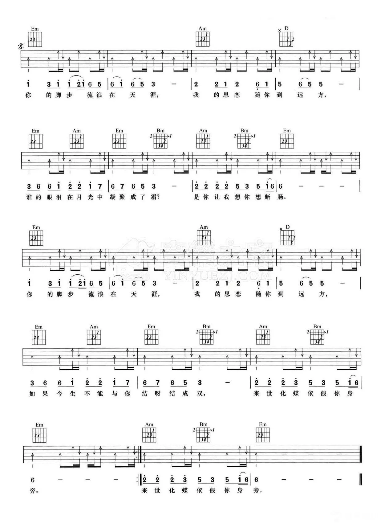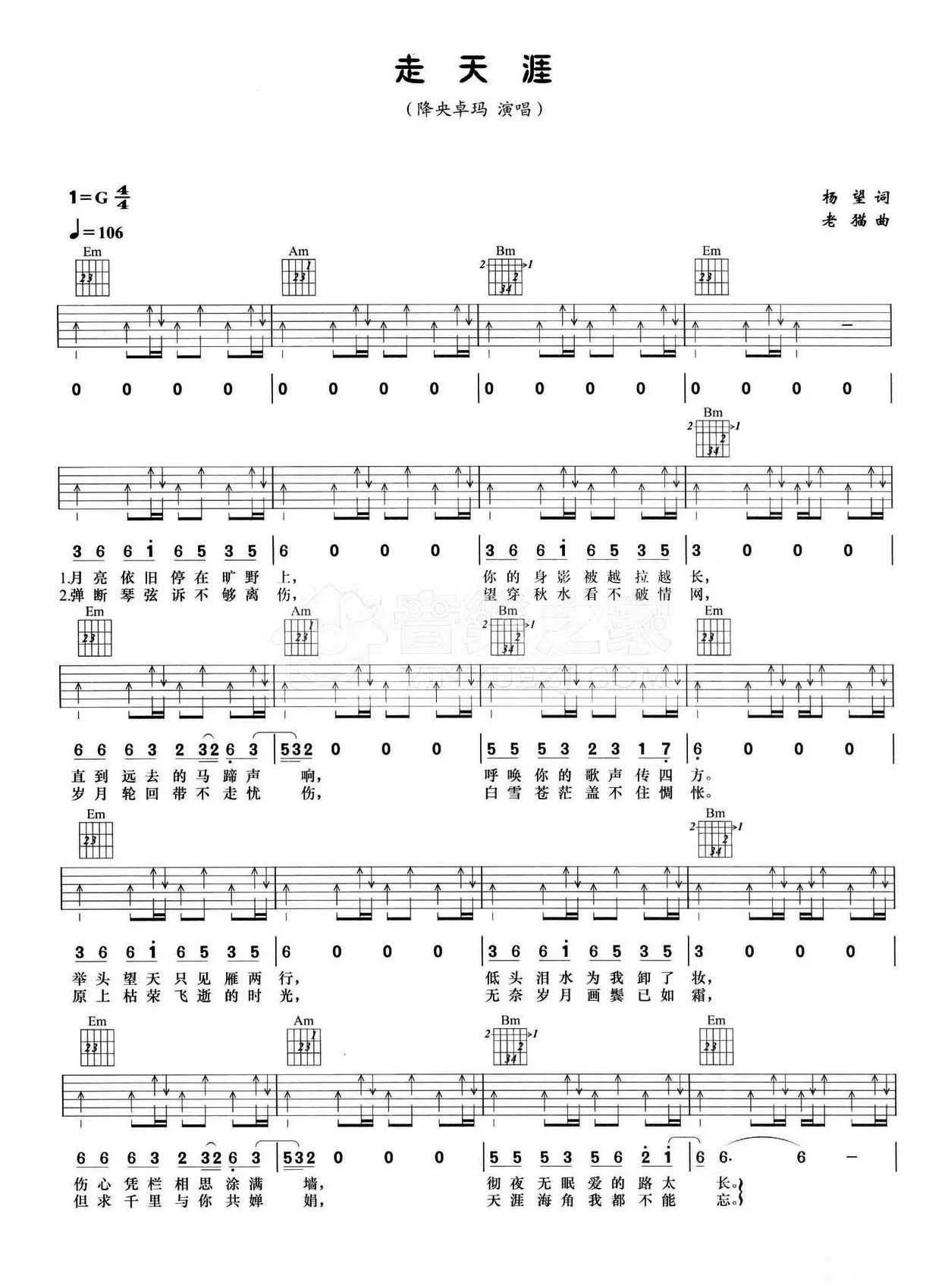 曲谱介绍: G调版《走天涯》吉他弹唱六线谱