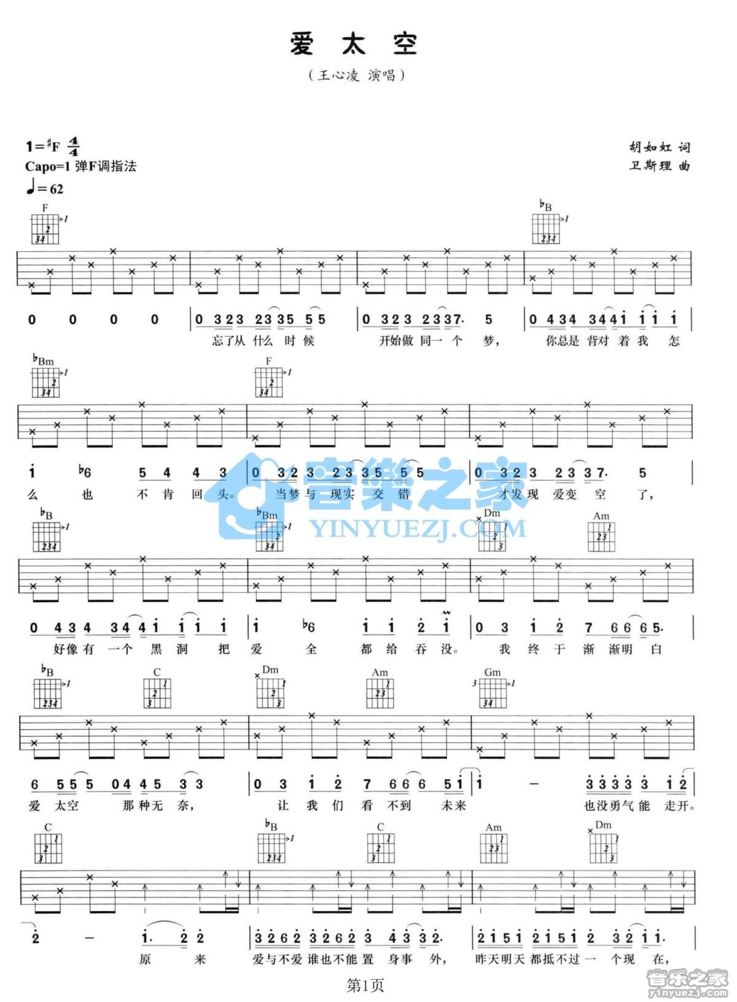 曲谱介绍: F调版《爱太空》吉他弹唱六线谱