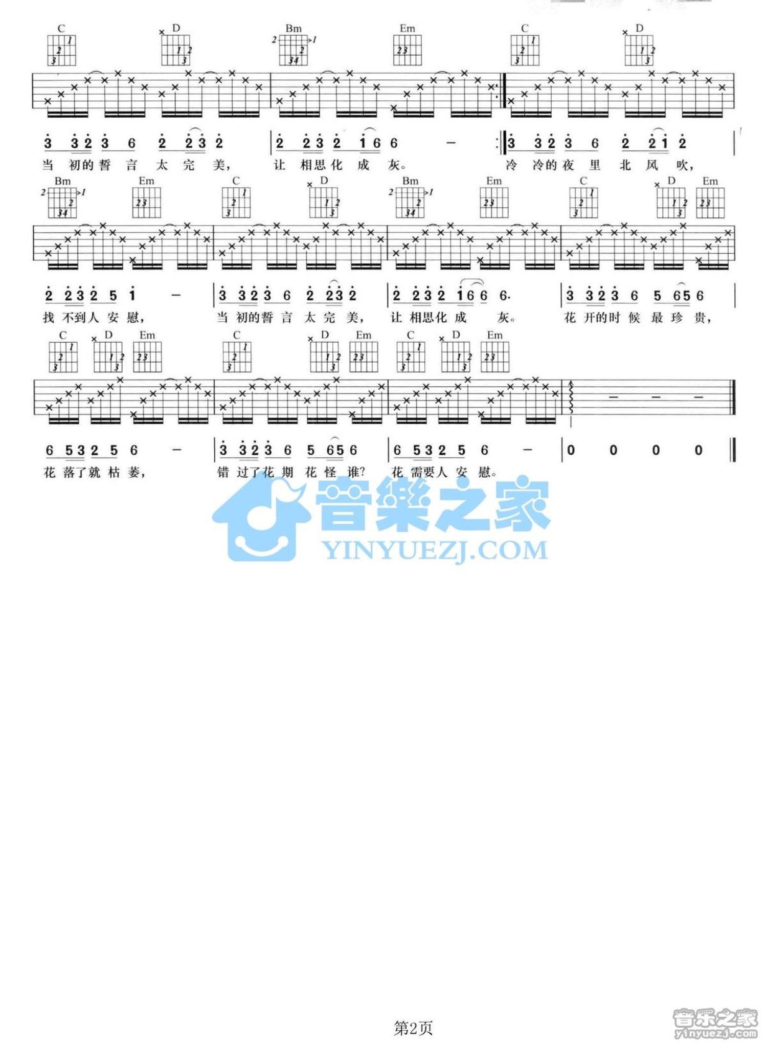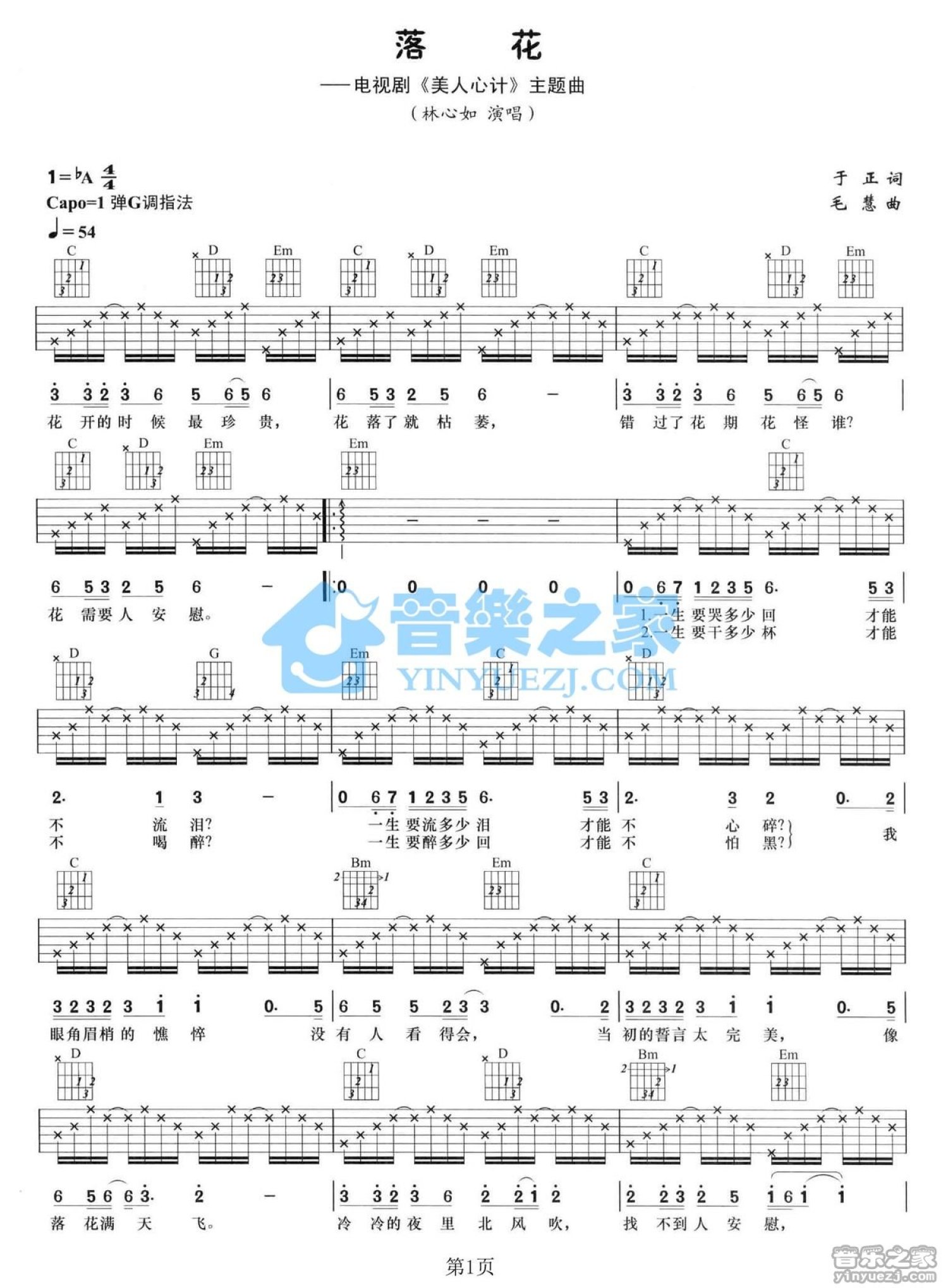 曲谱介绍: G调版林心如《落花》吉他弹唱六线谱