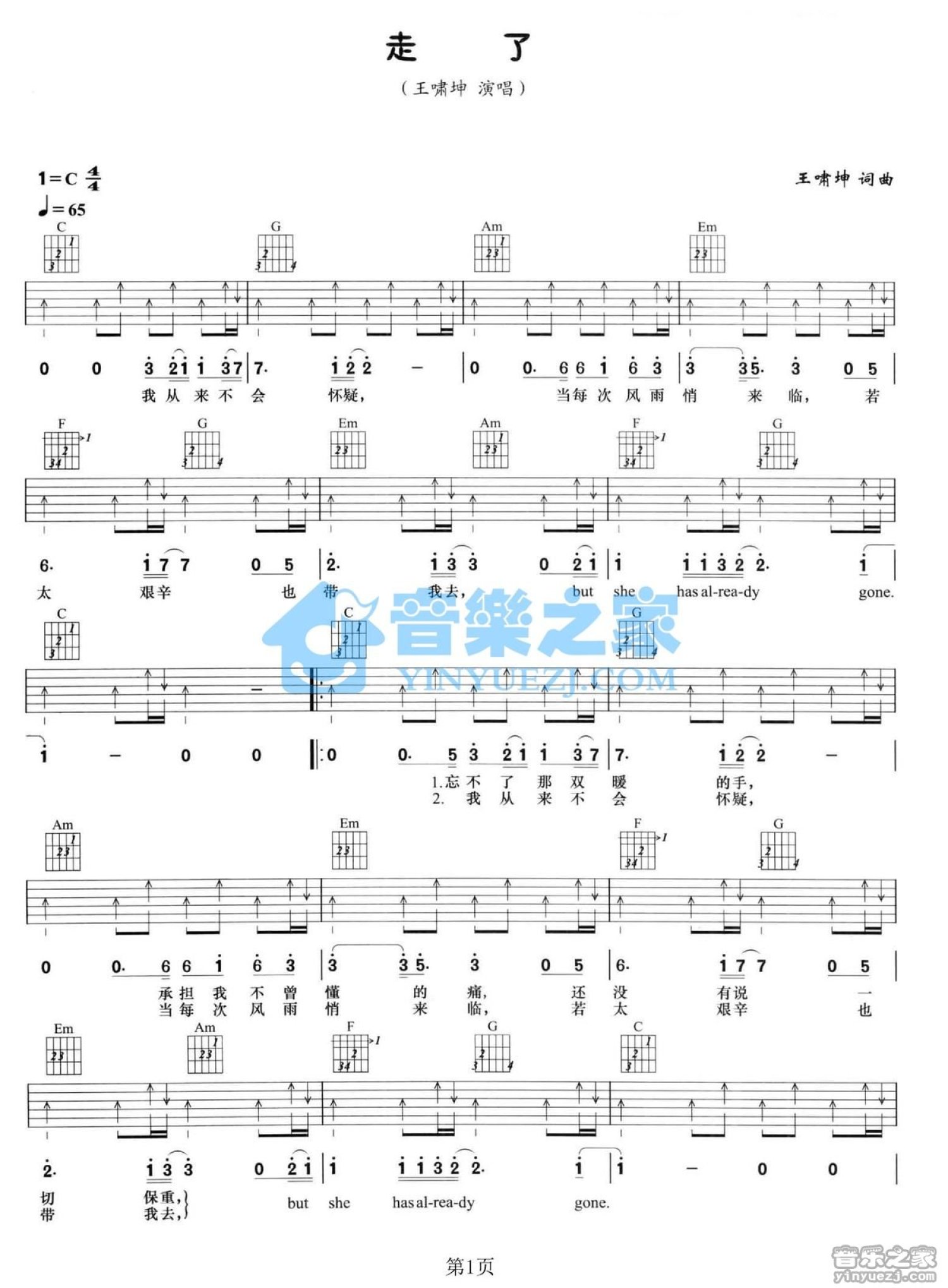 曲谱介绍: C调版王啸坤《走了》吉他弹唱六线谱