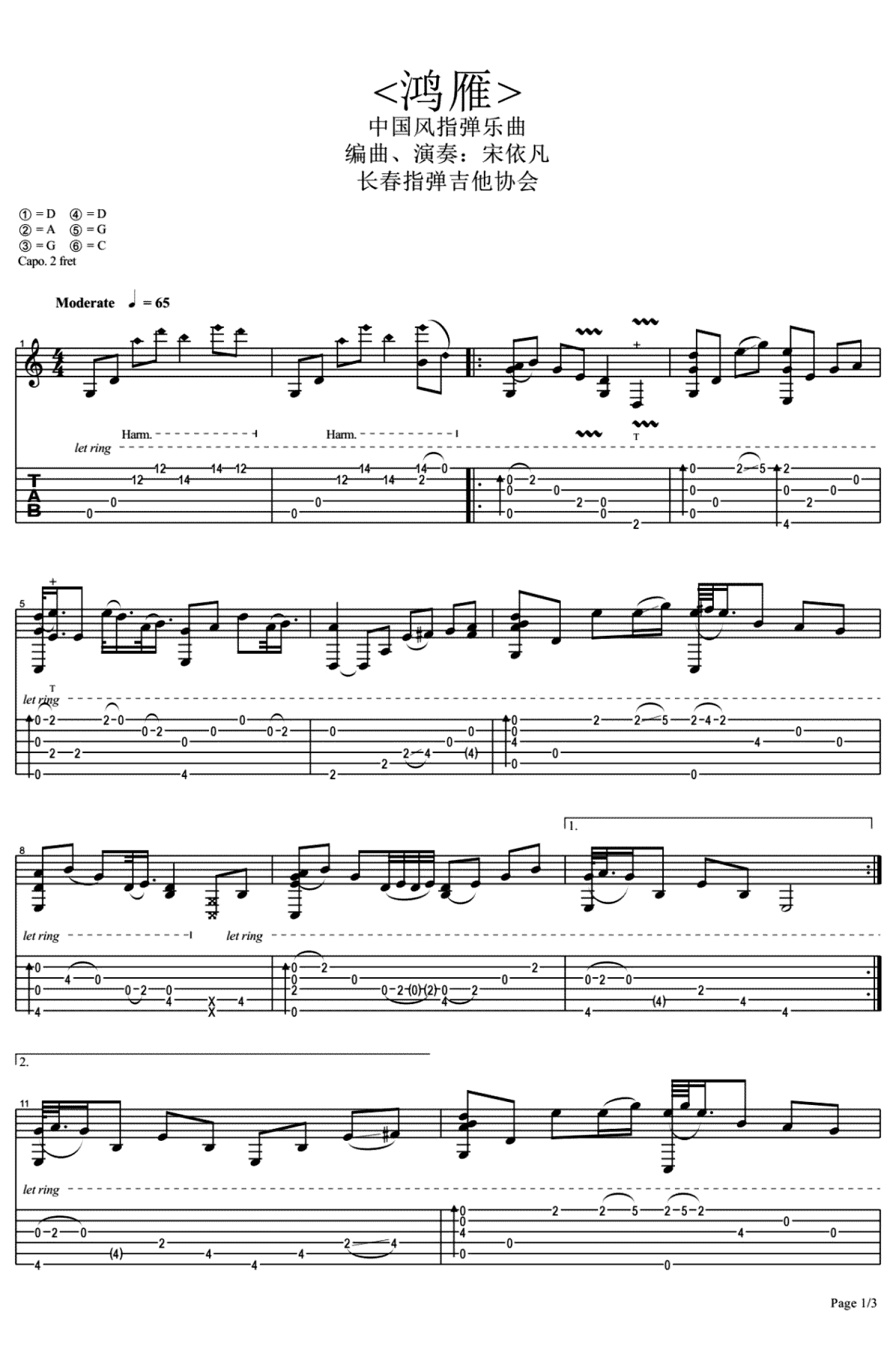 鸿雁吉他谱 - 中国风指弹乐曲 - 吉他独奏谱