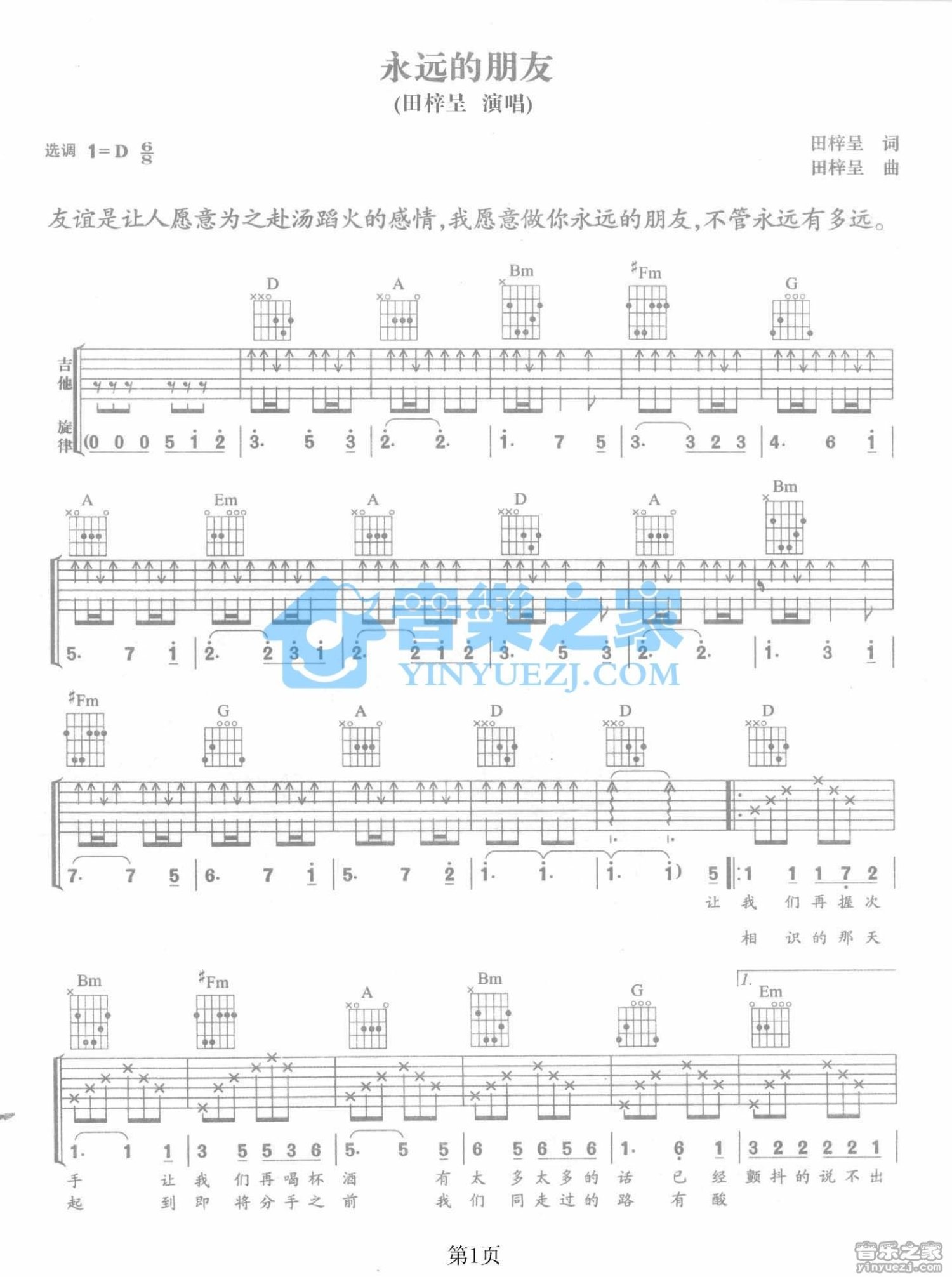 曲谱介绍: D调版庞龙《永远的朋友》吉他弹唱六线谱